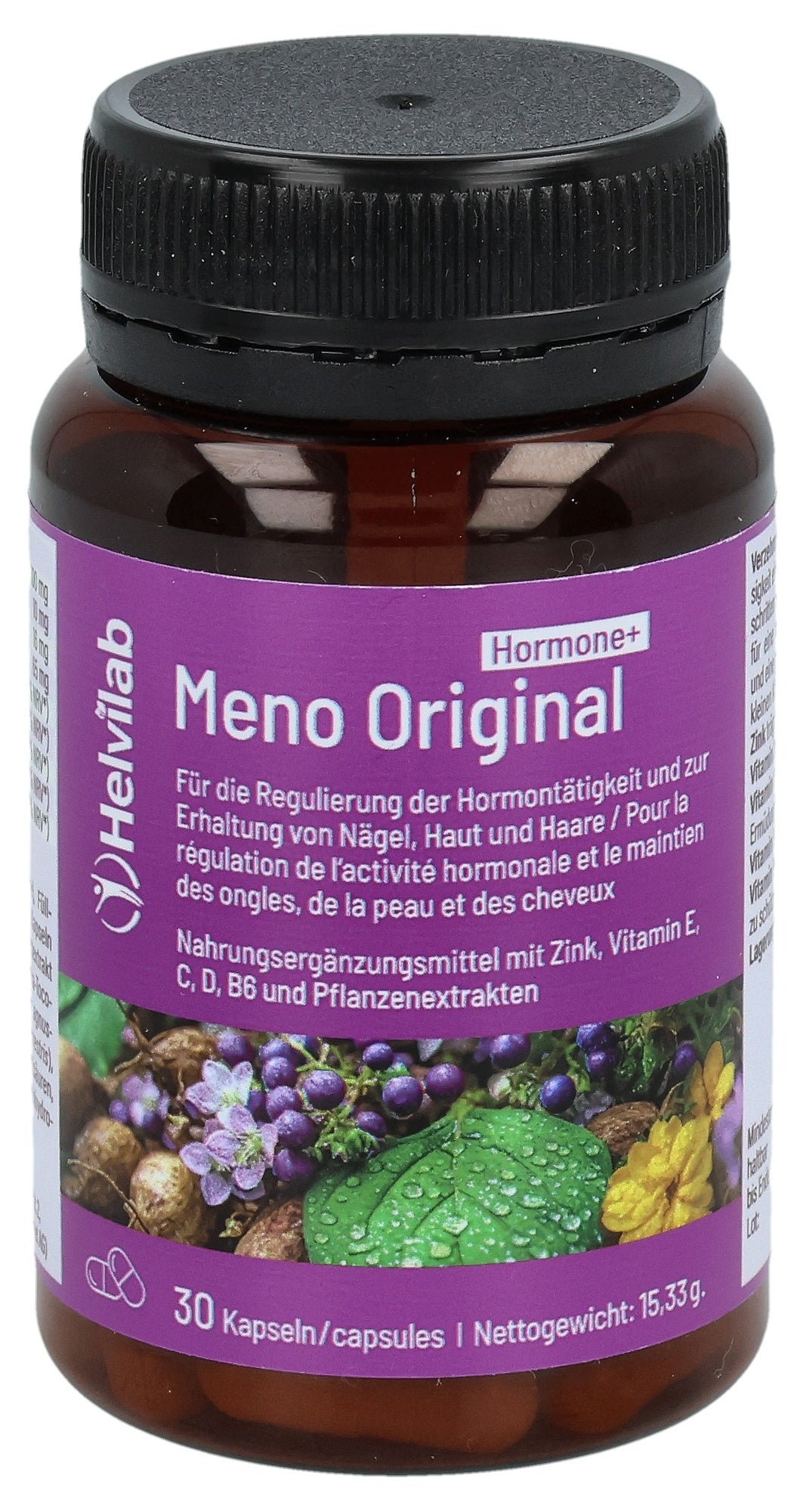 Complément alimentaire contenant du zinc, des vitamines E, C, D, B6 et des extraits de plantes.