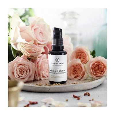 Pour l'effet GLOW ultime. Midnight Beauty est le Saint Graal de FLOWER & SPICE. Ce puissant mélange de 10 huiles harmonisantes donne des résultats immédiats. Ce sérum luxueux hydrate intensément la peau, éclaircit les rides et ridules et aide à réguler la production naturelle d'huile de la peau. Le résultat est un grain de peau unifié et une peau nourrie et revitalisée. Renforce l'action de Soothe & Repair. Powerfood pour la peau: 10 huiles naturelles puissantes (dont l'huile de figue de Barbarie. Huile de pépins de prune. huile d'argan, sacha inchi, onagre et huile de macadamia) garantissent un effet puissant dès la 1ère nuit. L'huile de graines de coriandre a un effet antibactérien, antioxydant et anti-inflammatoire - aide à lutter contre les impuretés et harmonise le grain de peau. L'huile de rose pure favorise l'irrigation sanguine de la peau et la renforce de l'intérieur. Le parfum doux et floral luxueux a un effet relaxant pendant l'application. La combinaison puissante de fleurs et d'épices.