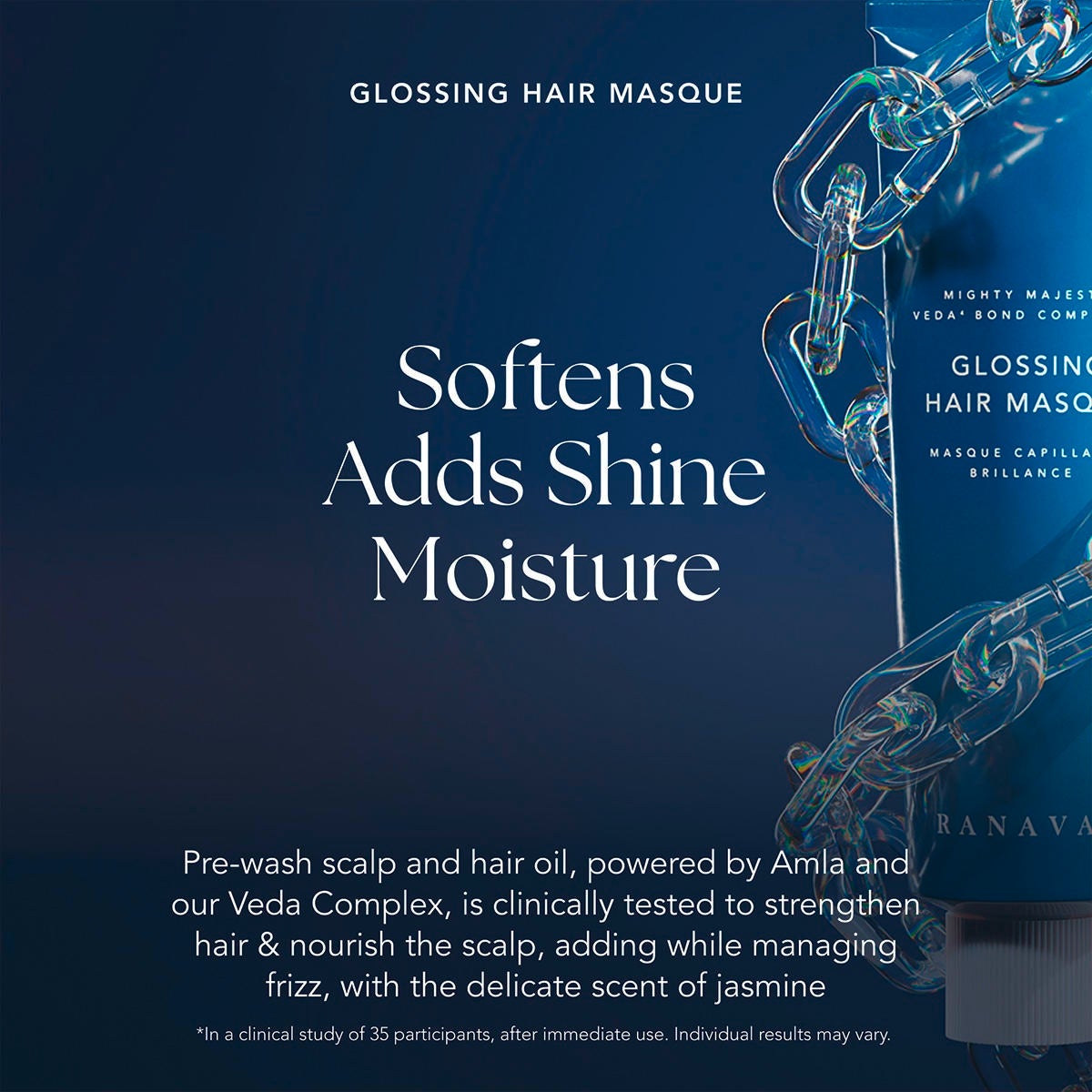 Veda4 Bond Strengthening Complex™ développé par RANAVAT et à un mélange efficace de hennagloss transparent, d'acide hyaluronique et d'huile de graines de moringa, ce masque hydrate et fait briller les cheveux ternes, cassants et abîmés, tout en les renforçant et en les rendant plus faciles à coiffer. Dans une étude clinique, après 1 application :