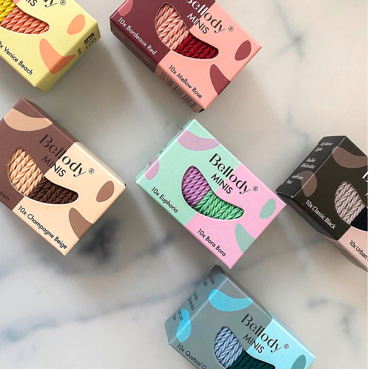 Les minis Bellody compacts sont idéaux pour les petites tresses, les coiffures tressées stylées et tous les looks créatifs. Une boîte contient 10 élastiques par couleur. La structure striée spéciale s'adapte aux différents types de cheveux et assure une tenue maximale - sans exercer de pression sur la tête.