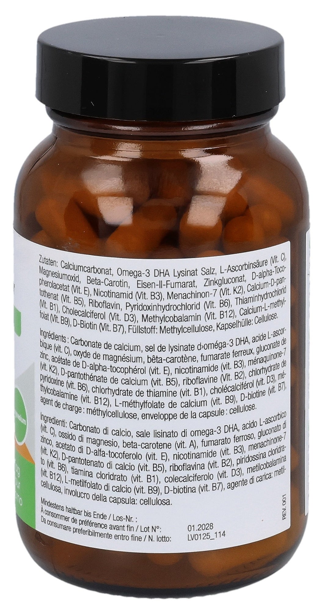 Pour 2 capsules: Carbonate de calcium, sel de lysinate d’oméga-3 DHA (125 mg), acide L-ascorbique (Vit. C), oxyde de magnésium, bêta-carotène (Vit. A), fumarate ferreux, gluconate de zinc, acétate de D-alpha-tocophérol (Vit. E), nicotinamide (Vit. B3), ménaquinone-7 (Vit. K2), pantothénate de calcium (Vit. B5), riboflavine (Vit. B2), chlorhydrate de pyridoxine (Vit. B6), chlorhydrate de thiamine (Vit. B1), cholécalciférol (Vit. D3), méthylcobalamine (Vit. B12), L-méthylfolate de calcium (Vit. B9) (300 µg, VNR : 150 %), D-biotine (Vit. B7), agent de charge : méthylcellulose, enveloppe de la gélule : cellulose.