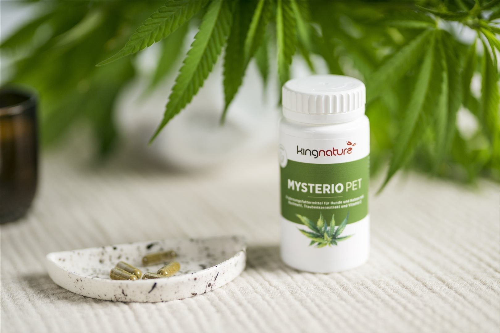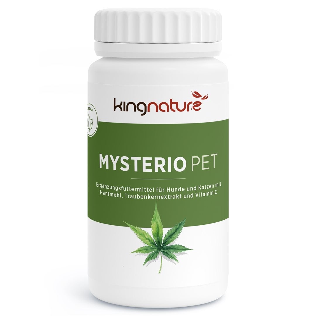 Complément alimentaire pour chiens et chats avec farine de chanvre, extrait de pépins de raisin et vitamine C.