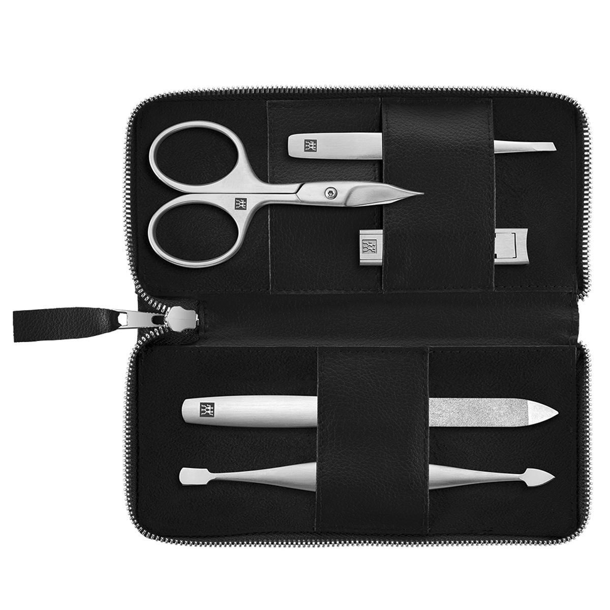 - Composé de ciseaux à ongles et à peau, d'un coupe-ongles compact, d'une lime à ongles en saphir, d'un poussoir et d'un nettoyeur de cuticules et d'une pince à épiler inclinée