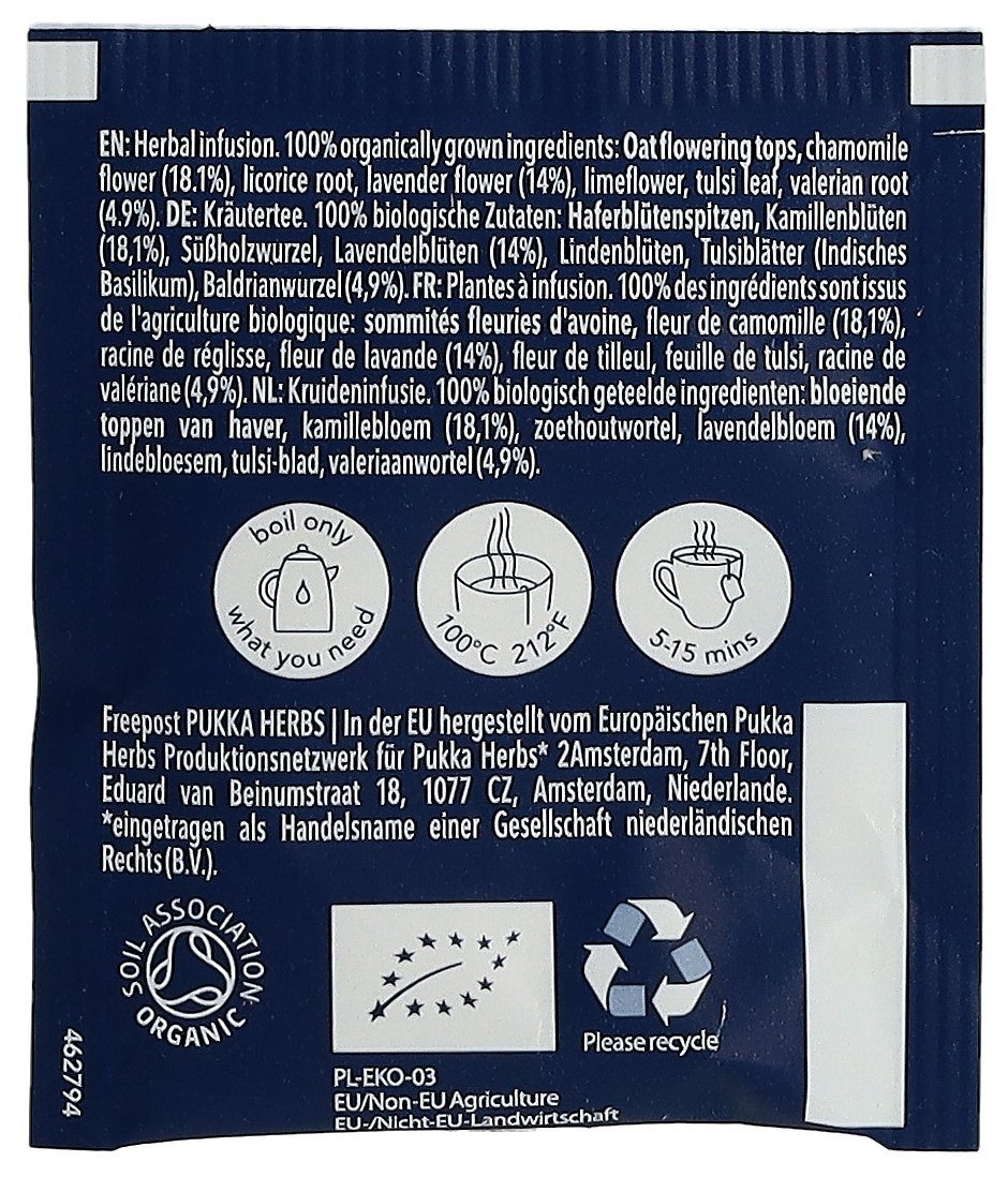 Preparation: Laisser infuser jusqu’à 15 minutes. Ne faire bouillir que la quantité d’eau nécessaire pour chaque tasse Pukka et encourager une consummation des plus responsables.