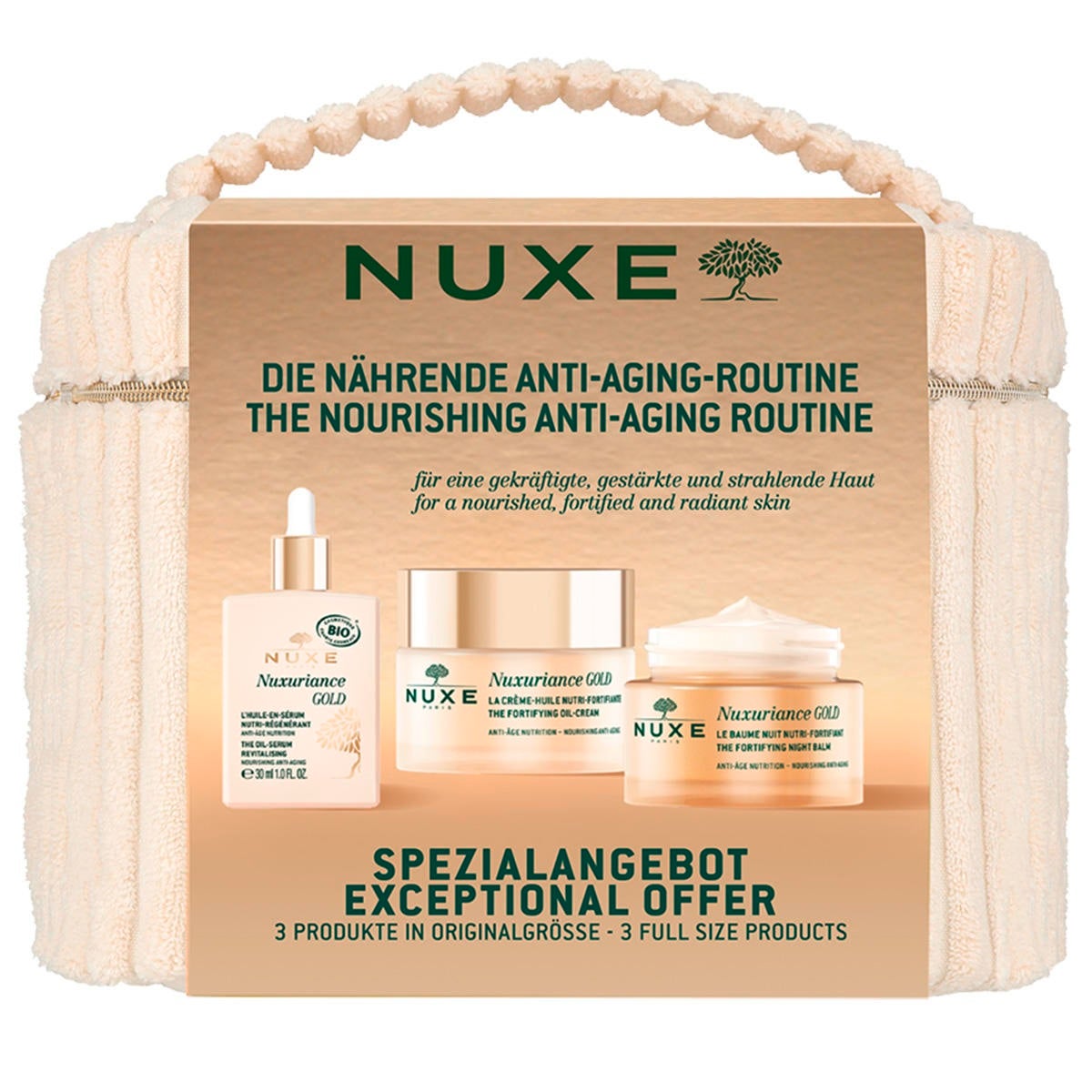 Nuxuriance Gold Öl Creme: AQUA/WATER, SQUALANE, GLYCERIN, COCO-CAPRYLATE, BEHENYL ALCOHOL, MACADAMIA INTEGRIFOLIA SEED OIL, ARACHIDYL ALCOHOL, DIMETHICONE, CETEARYL ALCOHOL, HYDROGENATED COCONUT OIL, PARFUM/FRAGRANCE, ARACHIDYL GLUCOSIDE, ACRYLATES/C10-30 ALKYL ACRYLATE CROSSPOLYMER, PHENOXYETHANOL, ETHYLHEXYLGLYCERIN, SODIUM STEAROYL GLUTAMATE, DEHYDROACETIC ACID, CAPRYLOYL GLYCINE, SODIUM GLUCONATE, SODIUM HYDROXIDE, XANTHAN GUM, CITRIC ACID, HYALURONIC ACID, BOUGAINVILLEA GLABRA LEAF CELL EXTRACT, DECYL GLUCOSIDE, GLUTAMINE, PHENETHYL ALCOHOL, MICA, BRASSICA CAMPESTRIS (RAPESEED) SEED OIL, CI 77491/IRON OXIDES, SOLANUM LYCOPERSICUM (TOMATO) FRUIT EXTRACT, CISTUS INCANUS FLOWER/LEAF/STEM EXTRACT, GYNOSTEMMA PENTAPHYLLUM LEAF/STEM EXTRACT, TOCOPHEROL, ETLINGERA ELATIOR EXTRACT, SIMMONDSIA CHINENSIS (JOJOBA) SEED OIL, CROCUS SATIVUS FLOWER EXTRACT, EICHHORNIA CRASSIPES EXTRACT, BENZYL ALCOHOL, BENZYL SALICYLATE, LINALOOL, COUMARIN, GERANIOL, CITRONELLOL [N4002/B]. Nuxuriance Gold Nachtbalsam: AQUA/WATER, DICAPRYLYL ETHER, BEHENYL ALCOHOL, GLYCERIN, MACADAMIA INTEGRIFOLIA SEED OIL, CETEARYL ALCOHOL, DIMETHICONE, BUTYROSPERMUM PARKII (SHEA) BUTTER, ARACHIDYL ALCOHOL, SQUALANE, PARFUM/FRAGRANCE, LAURYL LAURATE, TOCOPHEROL, ARACHIDYL GLUCOSIDE, ACRYLATES/C10-30 ALKYL ACRYLATE CROSSPOLYMER, PHENOXYETHANOL, ETHYLHEXYLGLYCERIN, SODIUM STEAROYL GLUTAMATE, DEHYDROACETIC ACID, CAPRYLOYL GLYCINE, SODIUM GLUCONATE, SODIUM HYDROXIDE, XANTHAN GUM, CITRIC ACID, HYALURONIC ACID, BOUGAINVILLEA GLABRA LEAF CELL EXTRACT, DECYL GLUCOSIDE, GLUTAMINE, PHENETHYL ALCOHOL, MICA, CISTUS INCANUS FLOWER/LEAF/STEM EXTRACT, GYNOSTEMMA PENTAPHYLLUM LEAF/STEM EXTRACT, BRASSICA CAMPESTRIS (RAPESEED) SEED OIL, CI 77491/IRON OXIDES, SOLANUM LYCOPERSICUM (TOMATO) FRUIT EXTRACT, ETLINGERA ELATIOR EXTRACT, SIMMONDSIA CHINENSIS (JOJOBA) SEED OIL, CROCUS SATIVUS FLOWER EXTRACT, BENZYL ALCOHOL, EICHHORNIA CRASSIPES EXTRACT, BENZYL SALICYLATE, LINALOOL, COUMARIN, GERANIOL, CITRONELLOL [N4003/B]. Nuxuriance Gold Öl Serum: SIMMONDSIA CHINENSIS (JOJOBA) SEED OIL*, SESAMUM INDICUM (SESAME) SEED OIL*, MACADAMIA INTEGRIFOLIA SEED OIL*, PERSEA GRATISSIMA (AVOCADO) OIL*, OLEIC/LINOLEIC/LINOLENIC POLYGLYCERIDES, PARFUM/FRAGRANCE, BRASSICA CAMPESTRIS (RAPESEED) SEED OIL*, TOCOPHEROL, HELIANTHUS ANNUUS (SUNFLOWER) SEED OIL, POLYGLYCERYL-3 DIISOSTEARATE, ORYZA SATIVA (RICE) EXTRACT, ORYZA SATIVA (RICE) GERM EXTRACT, LINALOOL, LIMONENE, CITRAL, GERANIOL [N5002/A].