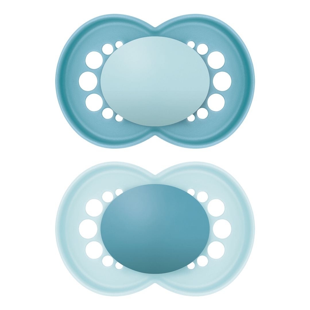 lot de 2 sucettes classiques de MAM. La tétine est en silicone soyeux qui rappelle la peau de maman. Grâce aux grands trous daération et à lintérieur rugueux, elles sont douces pour la peau.