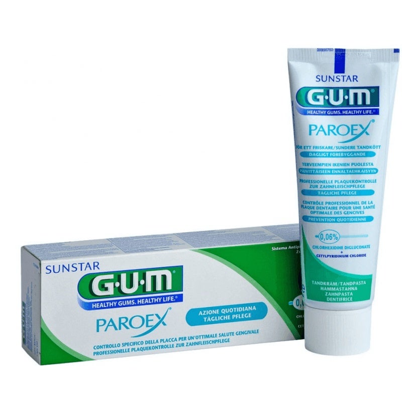 Le dentifrice Sunstar GUM Paroex 0.06% est idéal pour prévenir laccumulation de la plaque dentaire ainsi que les problèmes de gencives oblemen. Il est recommandé dès les premiers signes de gencives sensibles ou de gingivite, afin de prévenir les problèmes parodontaux oblem.