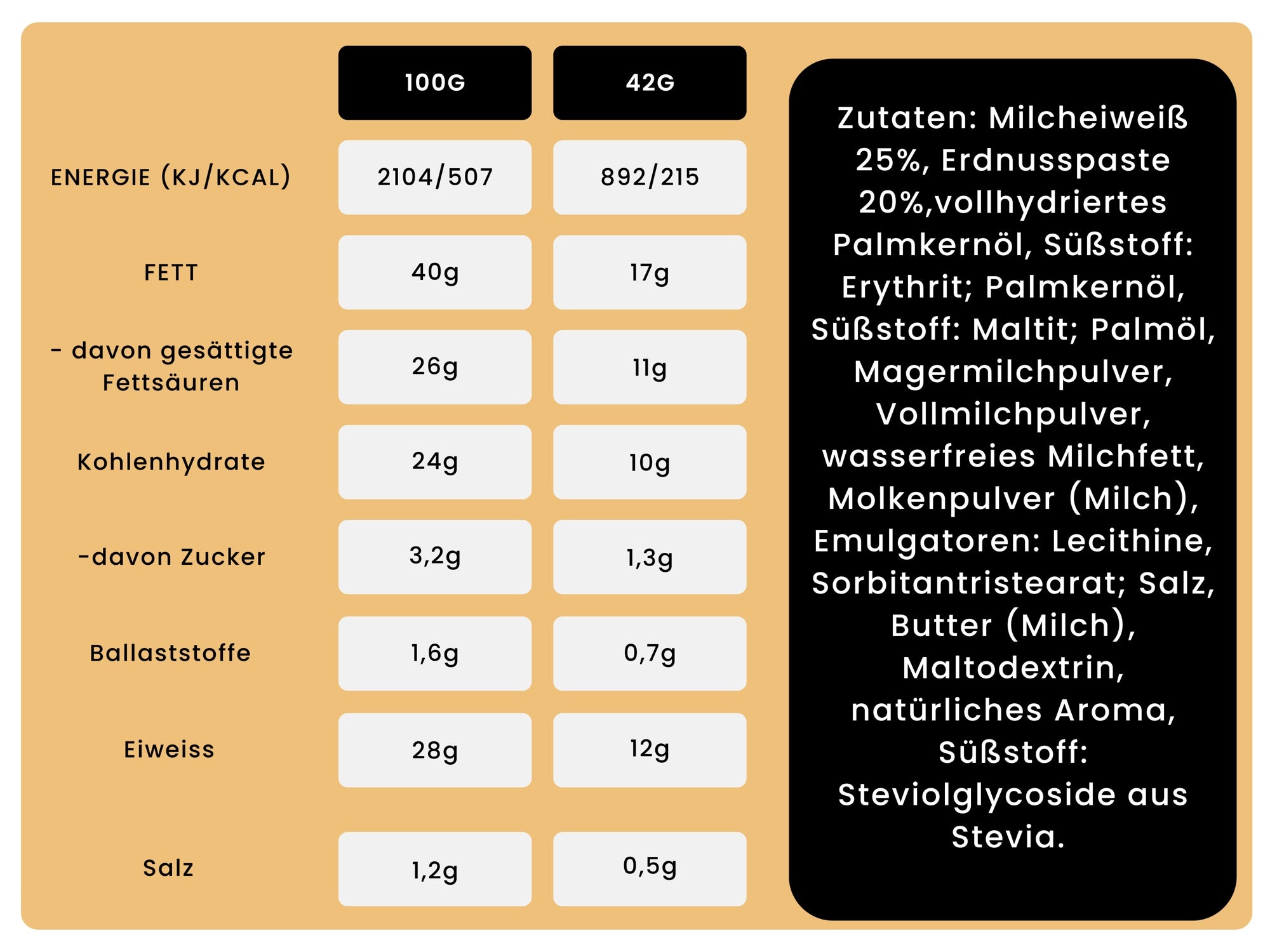 Nutry Nuts Milk Chocolate Peanut Butter Cups : chocolat au lait (52%) (protéines de lait en poudre, beurre de cacao, pâte de cacao, sucre de canne, édulcorant : érythritol, extrait de vanille, lécithine de tournesol) beurre de cacahuètes (43%) (cacahuètes, isolat de protéines de lactosérum (lait), sucre, édulcorant : érythritol, huile d'arachide, sel de mer) beurre de cacao.