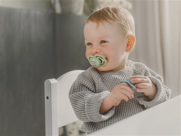 Forme symétrique toujours adaptée à la bouche de bébé. Mis au point en collaboration avec des dentistes pour favoriser le bon développement dentaire. Col de tétine extrêmement mince et souple.