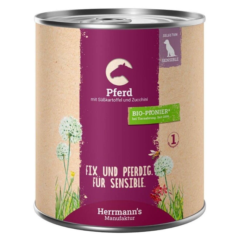 Laliment humide Herrmanns au cheval et à la patate douce riche en nutriments. Ce menu est un classique pour les chiens souffrant dallergies ou dintolérances, pauvre en graisses et sans céréales. La patate douce sert de source de glucides et de fibres. Le cheval est souvent utilisé pour les régimes dexclusion. Le menu est complété par de la levure de bière pour les vitamines B, de lhuile Nachtke rzen avec des acides gras oméga-6 et pour un pelage brillant et sain, du calcaire dalgues pour le calcium, de lhuile de foie de morue pour les vitamines A et D et du varech noué pour liode. Les menus pour les petits sensibles avec des ingrédients faciles à digérer comme le poulet, la carotte, le riz ou la chèvre - bien sûr avec une seule source de protéines animales. Ces aliments conviennent aux chiens sensibles sur le plan nutritionnel, mais aussi aux chiens âgés.