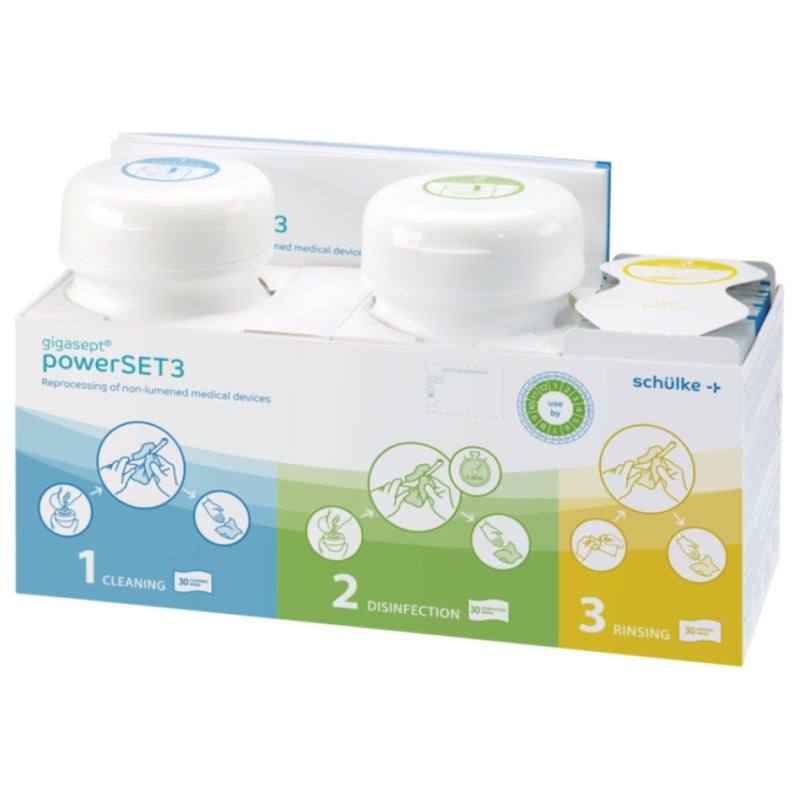 Ensuite, le Schülke gigasept powerSET3 disinfection wipe assure une désinfection finale virucide qui rend le dispositif médical hygiéniquement sûr. Enfin, le Schülke gigasept powerSET3 rinsing wipe permet déliminer soigneusement les éventuels résidus de désinfectant, de sorte que le produit est immédiatement prêt à lemploi et que les patients sont protégés de manière optimale.