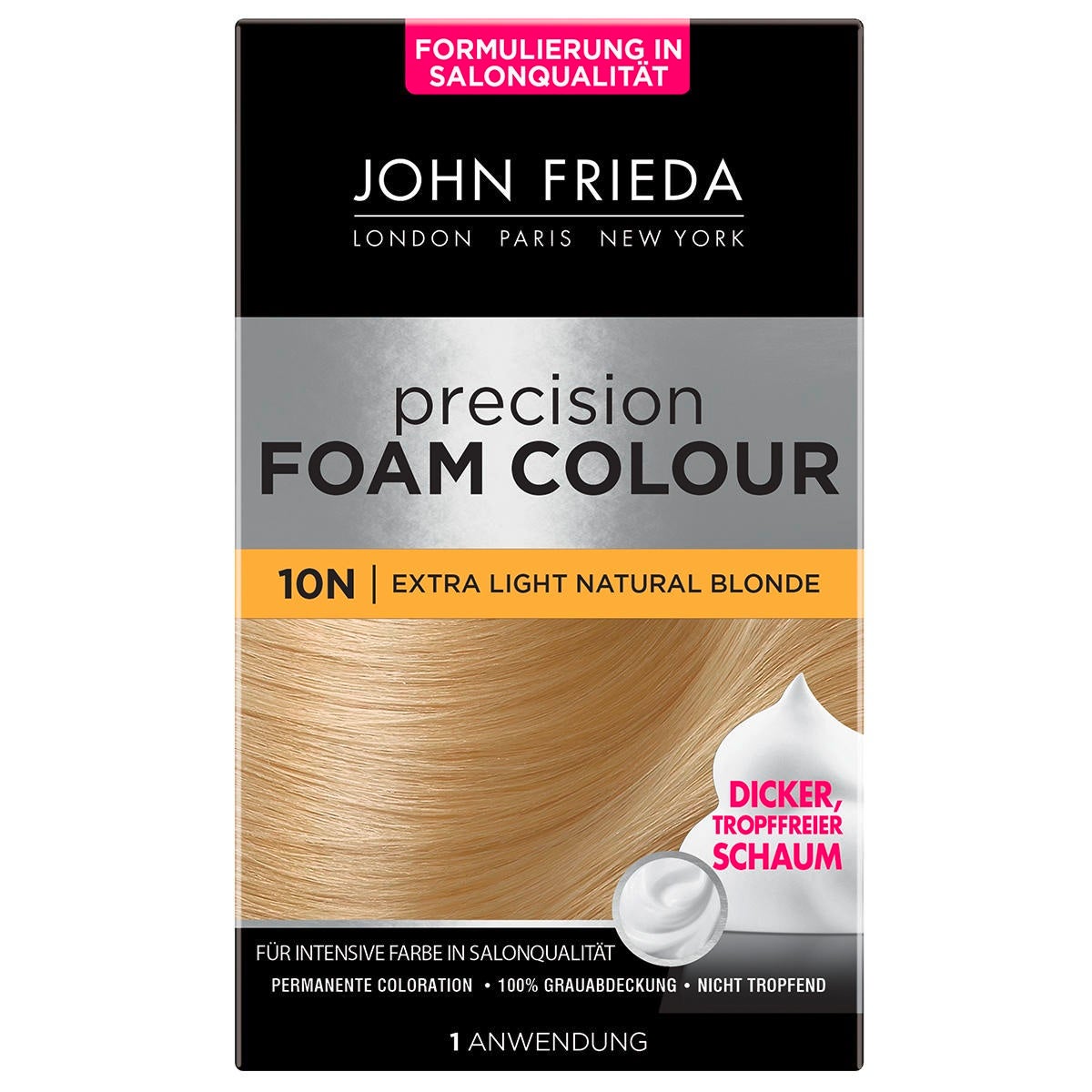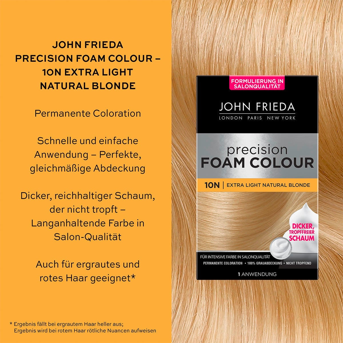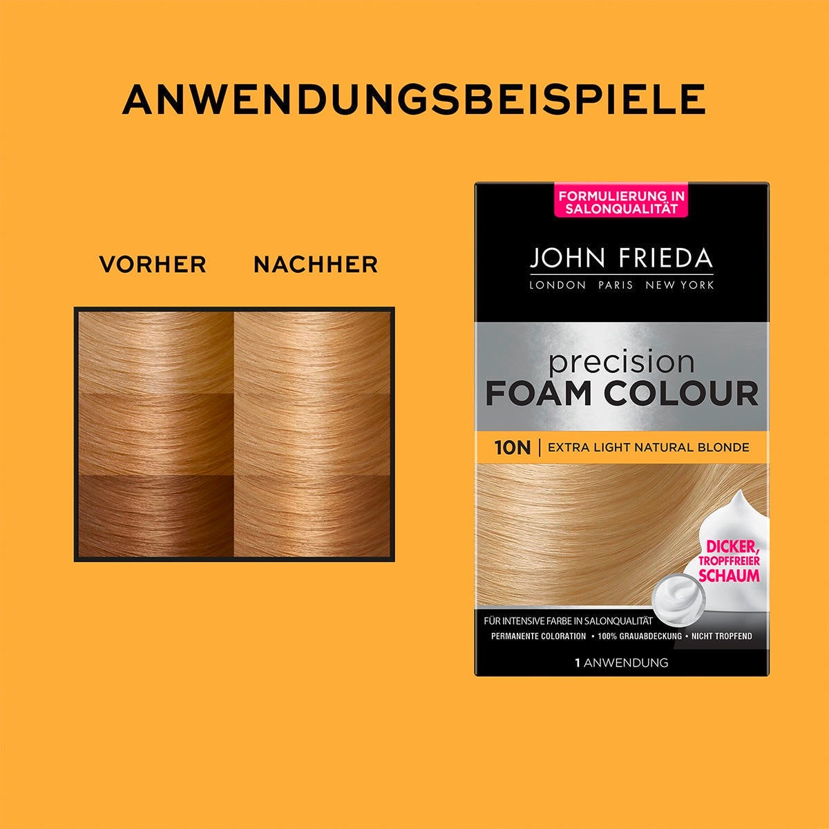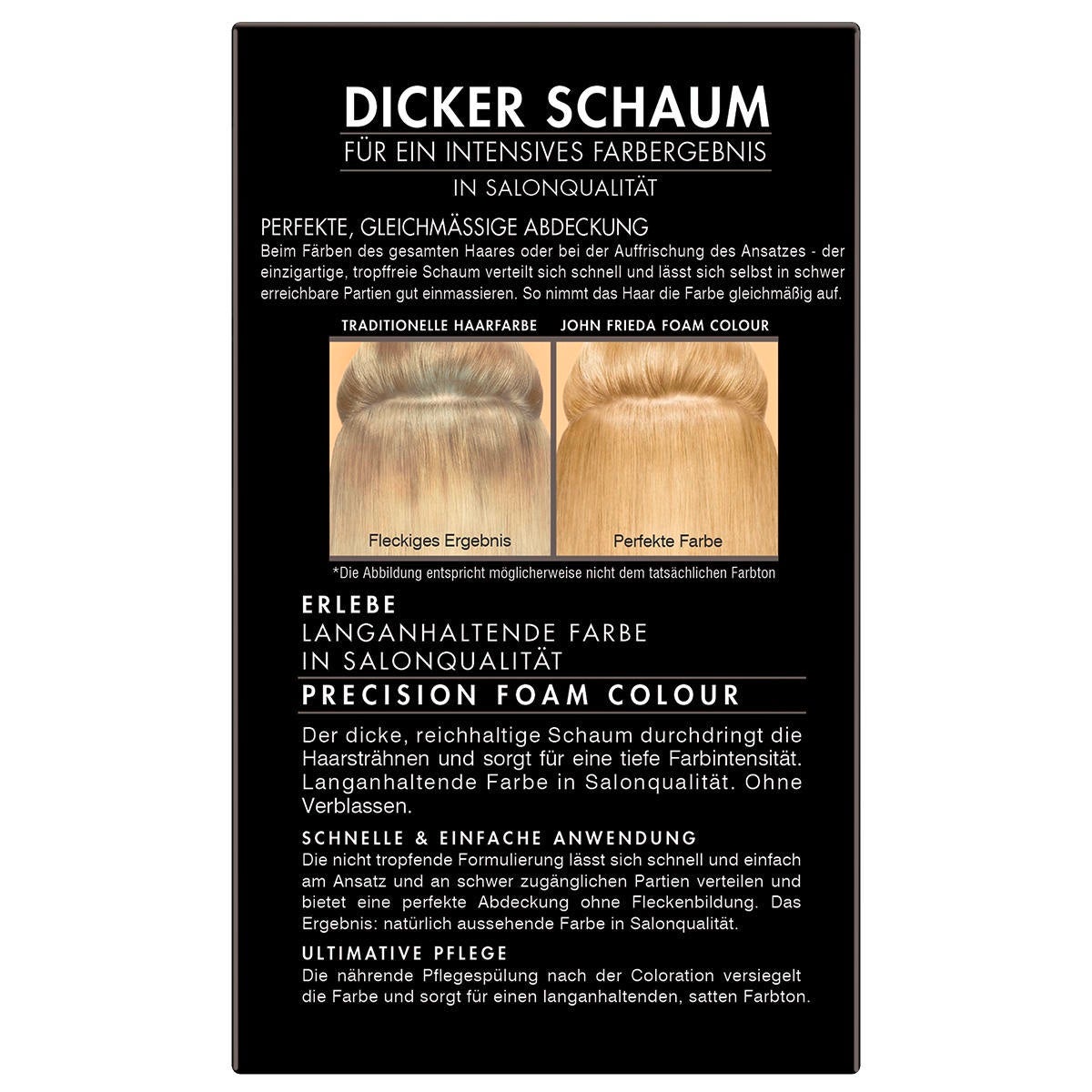 Contenu de la livraison : John Frieda Precision Foam Colour Contient : Coloration 32 ml, révélateur 48 ml, conditionneur 50 ml, embout pompe, gants de salon et mode d'emploi.