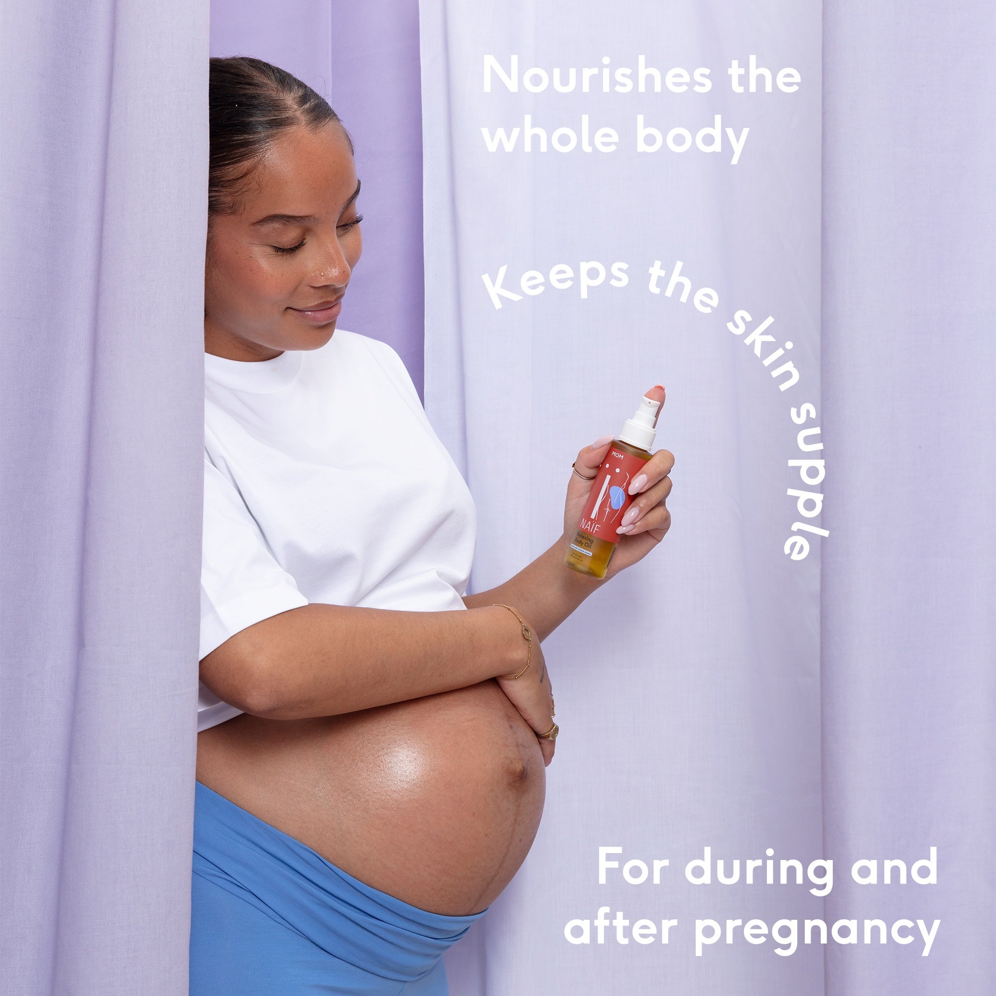 Hourra, un bébé est en route ! C'est une excellente noUVelle ! Mais il n'y a pas que votre corps qui change pendant la grossesse, votre peau aussi fait un travail incroyable et a besoin d'une dose supplémentaire de soins. Il y a un risque de voir apparaître des vergetures disgracieuses, une pigmentation gênante ou une peau sèche. En particulier aujourd'hui, il est d'autant plus important de prodiguer des soins appropriés et durables à l'aIDe d'ingrédients naturels. Nous le savons, c'est pourquoi nous évitons les produits chimiques qui peUVent irriter votre peau ou même perturber votre système hormonal. Il suffit de penser aux parabènes, aux silicones et aux huiles minérales nocives. Ils sont maUVais pour vous, votre peau et bien sûr votre bébé. C'est pourquoi Naïf a mis au point l'huile de grossesse relaxante" à base d'huile de jojoba et de pépins de raisin. Tout simplement naturel. Sans microplastiques, sans silicone et sans huile minérale. 100% végétalien. Convient à tous les types de peau, y compris les peaux sensibles. Appliquer deux à trois fois par jour sur l'abdomen, les fesses, les cuisses avec de légers moUVements circulaires. Veuillez éviter tout contact visuel.