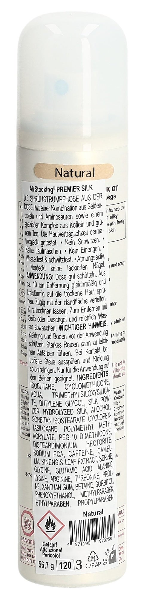 Propane, Butane, Petroleum Distillates, Cyclomethicone, Aqua, Titanium Dioxide, Trimethylsiloxysilicate, Iron Oxides, Butylene Glycol, Sorbitan Isostearate, Cyclopentasiloxane, Polymethyl Methacrylate, PEG-10 Dimethicone, Disteardimonium Hectorite, Sodium PCA, Silk Powder, Hydrolyzed Silk, Caffeine, Phenoxyethanol, Xanthan Gum, Camellia Sinensis, Serine, Glycine, Glutamic Acid, Alanine, Lysine, Arginine, Threonine, Proline, Betaine, Sorbitol..