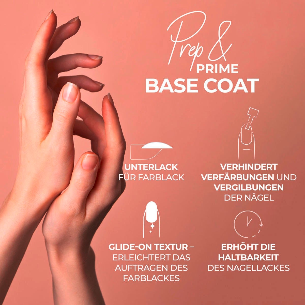 La préparation parfaite pour ton vernis à ongles préféré ! Le Prep & Prime - Base Coat est la couche de base idéale pour la couleur de ton vernis à ongles. Elle protège ton ongle naturel de manière fiable contre les décolorations et augmente en même temps la durabilité de ta couleur. Mais il peut faire encore plus ! Grâce à sa texture GLIDE-ON spéciale, il facilite l'application de ton vernis à ongles. Des résultats uniformes et sans traces sont ainsi garantis ! La Prep & Prime - Base Coat possède une texture extrêmement douce et fluide. Il s'applique très facilement et ne te fait pas perdre de temps. Cette sous-couche sèche en effet très rapidement.