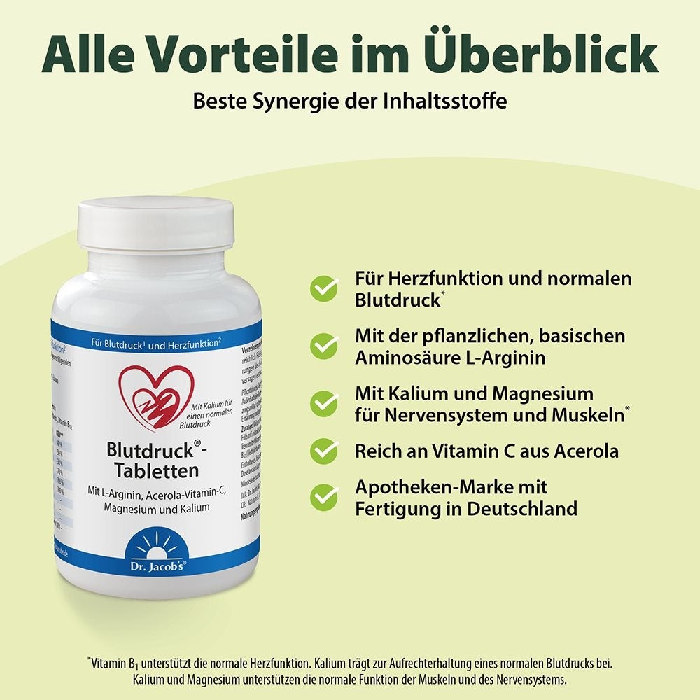 Une alimentation équilibrée et un mode de vie sain ne sont pas les seuls leviers pour agir favorablement sur la pression sanguine. L’apport ciblé en micronutriments, dans une combinaison adaptée, peut également contribuer efficacement au maintien d’une tension artérielle normale. Dr. Jacob’s Pression sanguine® Comprimés s’inspire d’une alimentation majoritairement végétale, associant des vitamines sélectionnées, des minéraux finement dosés et de la L-arginine d’origine végétale.