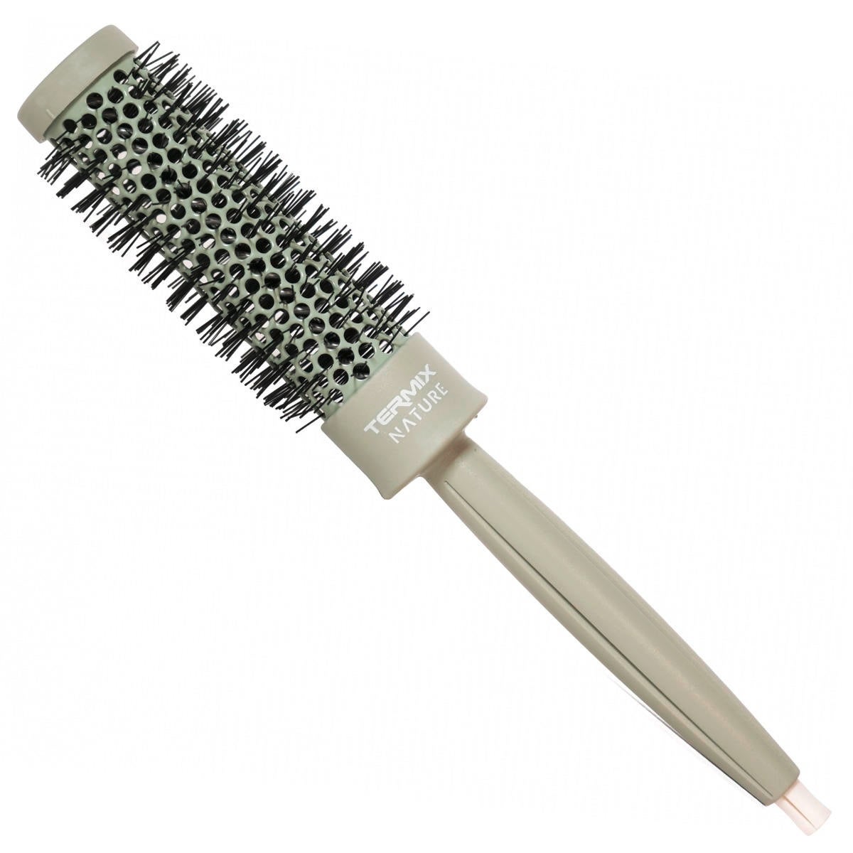 Les brosses de la ligne Termix Professional Nature sont fabriquées à partir d'un matériau naturel innovant qui présente des propriétés catalytiques permettant l'absorption des gaz nocifs en composés utiles, contribuant ainsi à purifier l'air en réduisant la concentration de ces polluants dans l'environnement. Ce processus de transformation est constant, de jour comme de nuit, et élimine tout type de pollution nocive pour la peau et pour l'homme, sans qu'il soit nécessaire de l'activer par des sources externes. La brosse se caractérise également par le fait qu'elle dispose de poils ionisés qui sont très résistants à la chaleur et peuvent retrouver leur stabilité initiale. La disposition verticale des poils permet en outre une meilleure pénétration dans les cheveux et offre ainsi une meilleure tenue. Le revêtement céramique du cylindre en aluminium assure une répartition uniforme de la chaleur sur toute la longueur, ce qui permet de sécher les cheveux plus rapidement et de mieux les traiter. Le manche est en polypropylène, un matériau très résistant et antiadhésif qui empêche les cheveux d'adhérer au manche. Il a été conçu dans une gamme de couleurs gris-vert pour être discret et intemporel. Sur la partie inférieure se trouve un pic utilisé pour séparer les mèches de cheveux, ce qui permet de gagner du temps et augmente le confort.