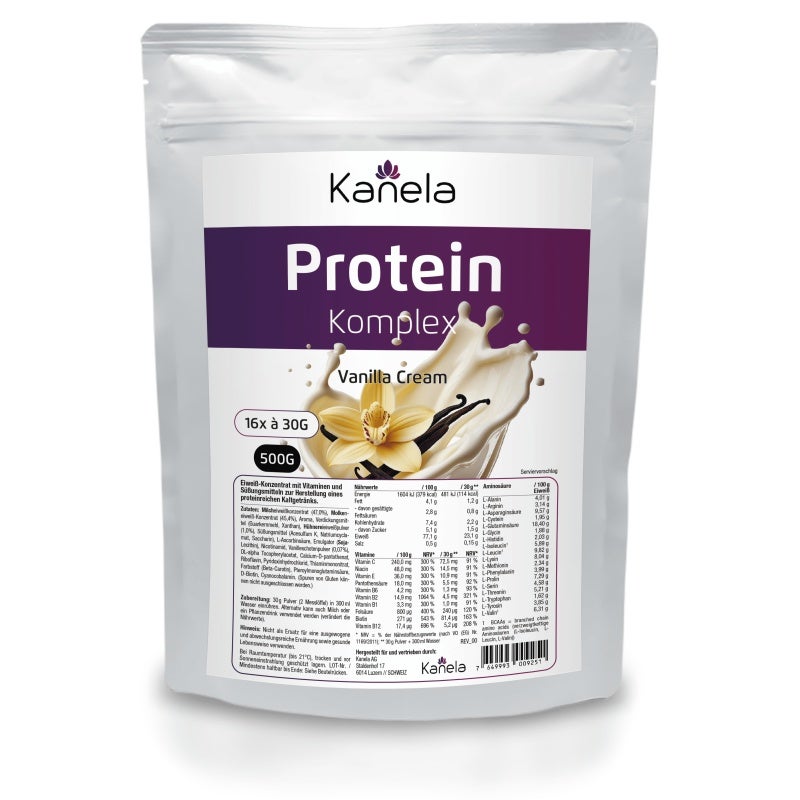 MILCHeiweißkonzentrat (47 %), MOLKENeiweißkonzentrat (45,4 %), Aroma, Verdickungsmittel (Guarkernmehl, Xanthan), HÜHNEREIeiweißpulver (1 %), Süßungsmittel (Acesulfam K, Natriumcyclamat, Saccharin), L-Ascorbinsäure, Emulgator SOJAlecithin, Nicotinamid, Vanilleschotenpulver (0,07 %), DL-alpha Tocopherylacetat, Calcium-D-pantothenat, Riboflavin, Pyridoxinhydrochlorid, Thiaminmononitrat, Farbstoff Beta-Carotin, Pteroylmonoglutaminsäure, D-Biotin, Cyanocobalamin.