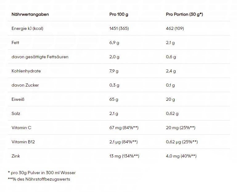 Grâce à sa bonne solubilité, elle fournit non seulement 20 g de protéines par portion, mais contient également les vitamines C et B12 ainsi que l'oligo-élément zinc, qui contribuent au fonctionnement normal du système immunitaire.