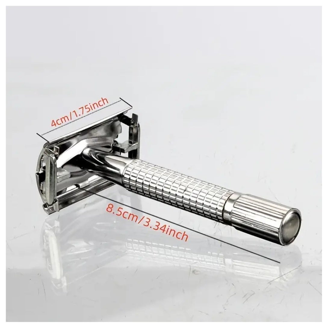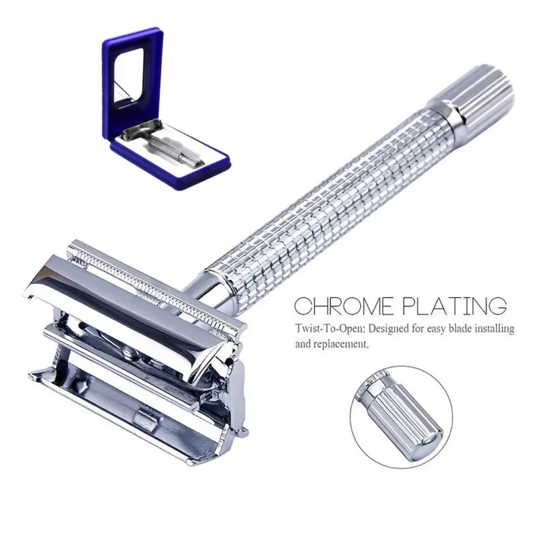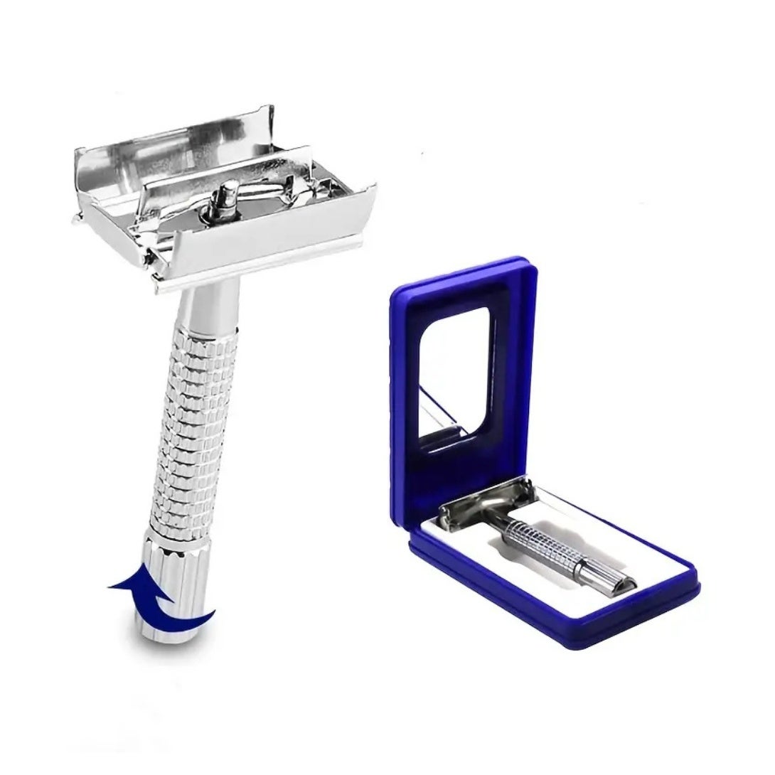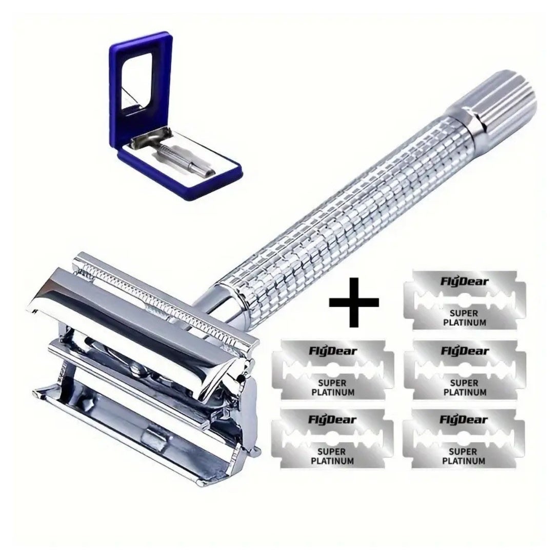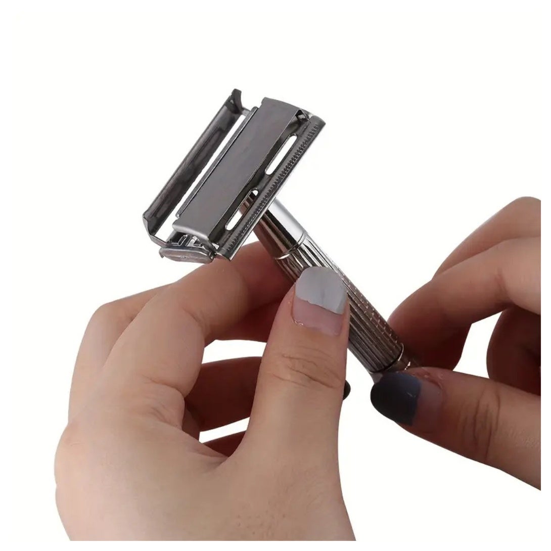 Découvrez le rasoir de sûreté en acier inoxydable livré avec 5 lames pour une rasage net, précis et durable. Son mécanisme papillon (butterfly) permet un changement de lame rapide et sécurisé, tandis que le manche antidérapant moleté assure une prise en main parfaite, même sous la douche. Compatible avec toutes les lames DE standard, il convient au visage et au corps.