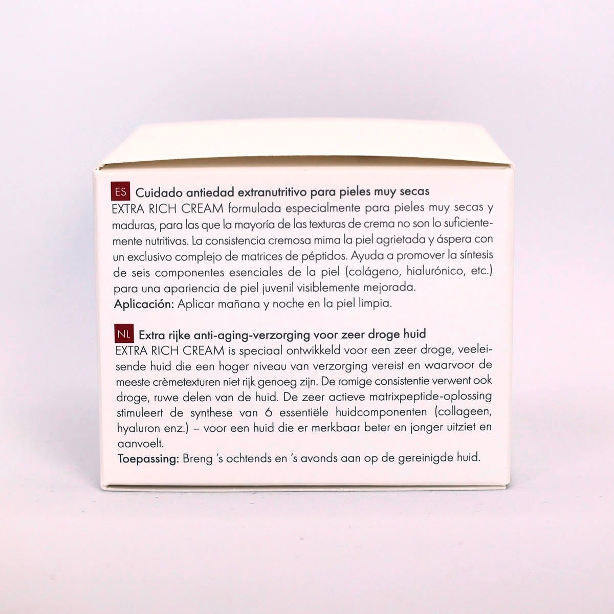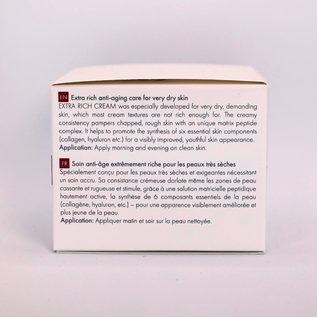 Recevez maintenant votre soin anti-âge préféré sous forme de recharge pratique pour notre pot rechargeable. EXTRA RICH CREAM a été spécialement conçue pour les peaux très sèches et exigeantes qui ont besoin de plus de soins et pour lesquelles la plupart des textures de crème ne sont pas assez riches. La consistance crémeuse dorlote également les zones de peau cassante et rugueuse et stimule, grâce à une solution de peptides matriciels hautement actifs, la synthèse de 6 composants essentiels de la peau (collagène, hyaluron, etc.) - pour une amélioration sensible de l'aspect de la peau et de sa jeunesse. Application : Appliquer matin et soir sur la peau nettoyée. Idéal en combinaison avec avec le AGE DELAY CONCENTRATE.