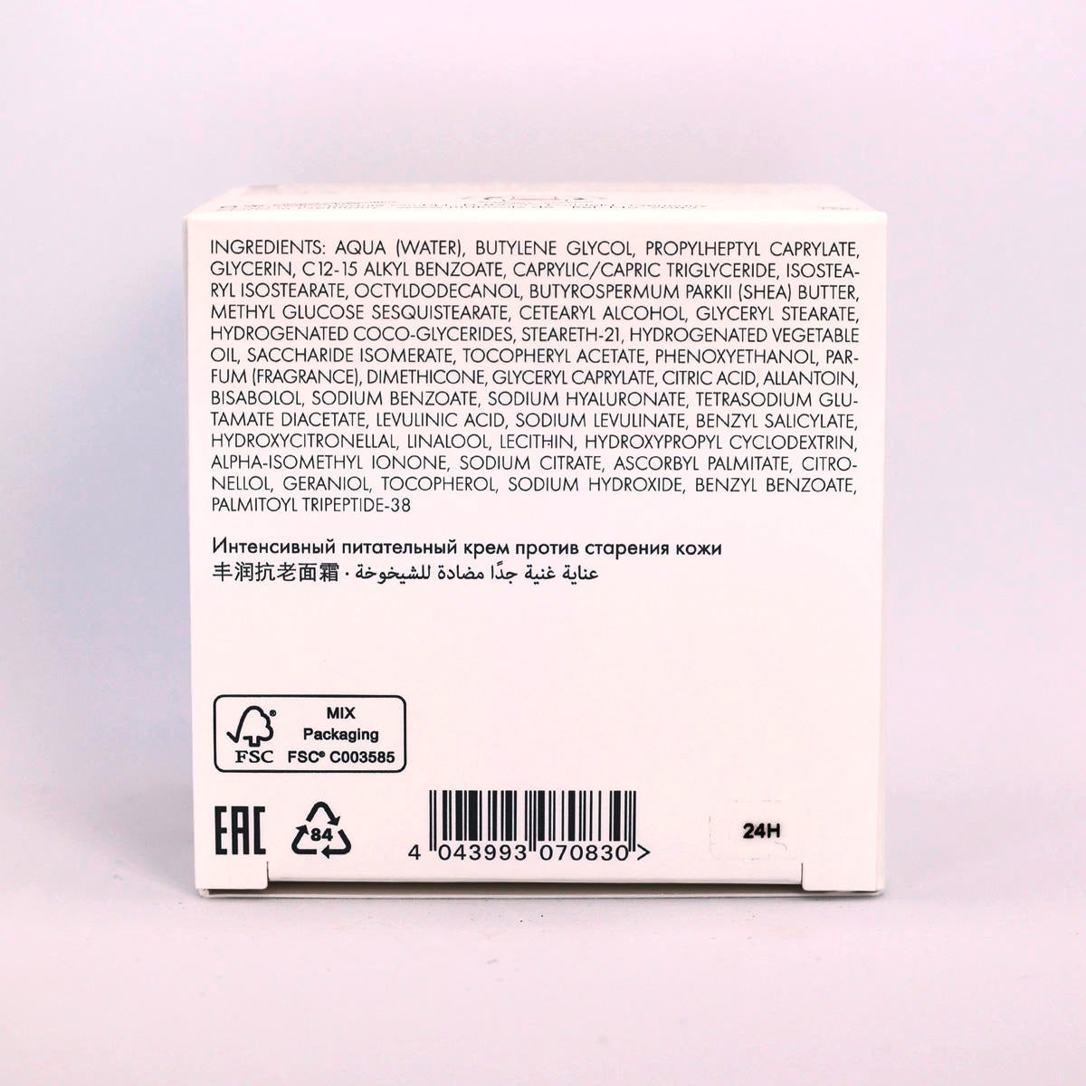 AQUA (WATER), BUTYLENE GLYCOL, PROPYLHEPTYL CAPRYLATE, GLYCERIN, C12-15 ALKYL BENZOATE, CAPRYLIC/CAPRIC TRIGLYCERIDE, ISOSTEARYL ISOSTEARATE, OCTYLDODECANOL, BUTYROSPERMUM PARKII (SHEA) BUTTER, METHYL GLUCOSE SESQUISTEARATE, CETEARYL ALCOHOL, GLYCERYL STEARATE, HYDROGENATED COCO-GLYCERIDES, STEARETH-21, HYDROGENATED VEGETABLE OIL, SACCHARIDE ISOMERATE, TOCOPHERYL ACETATE, PHENOXYETHANOL, PARFUM (FRAGRANCE), DIMETHICONE, GLYCERYL CAPRYLATE, CITRIC ACID, ALLANTOIN, BISABOLOL, SODIUM BENZOATE, SODIUM HYALURONATE, TETRASODIUM GLUTAMATE DIACETATE, LEVULINIC ACID, SODIUM LEVULINATE, BENZYL SALICYLATE, HYDROXYCITRONELLAL, LINALOOL, LECITHIN, HYDROXYPROPYL CYCLODEXTRIN, ALPHA-ISOMETHYL IONONE, SODIUM CITRATE, ASCORBYL PALMITATE, CITRONELLOL, GERANIOL, TOCOPHEROL, SODIUM HYDROXIDE, BENZYL BENZOATE, PALMITOYL TRIPEPTIDE-38.