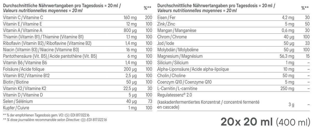 Le meilleur dans tout ça ? Avec seulement 20 ml par jour, vous obtenez tout ce dont vous avez besoin pour affronter les défis du quotidien avec sérénité et vous sentir bien – le tout avec un goût fruité et frais.