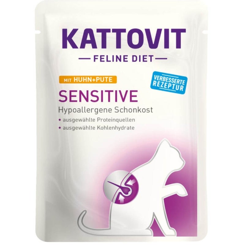 Kattovit Sensitive est spécialement conçu pour les chats souffrant dallergies ou dintolérances alimentaires. Cet aliment diététique favorise la réduction des symptômes dintolérance et contribue à stabiliser le système digestif. Il convient aux chats sensibles qui sont particulièrement sensibles à certaines sources de protéines ou de nutriments et favorise une alimentation digeste sans Belastration.