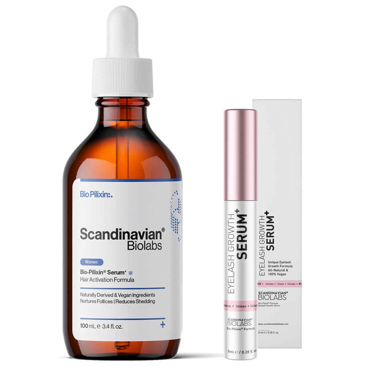 Scandinavian Biolabs Bio-Pilixin Serum Women: Aqua, Alcohol, Niacinamide, Caffeine, Curcuma Longa Callus Conditioned Media, Panthenol, Vanillyl Butyl Ether, Sodium PCA, Eucalyptus Globulus Leaf Oil, Sodium Lactate, Arginine, Aspartic Acid, PCA, Pentylene Glycol, Zinc PCA, Glycine, Alanine, Serine, Valine, Isoleucine, Proline, Threonine, Limonene, Histidine, Phenylalanine, Phytic Acid. Scandinavian Biolabs Eyelash Growth Serum: Aqua, Curcuma Longa Callus Conditioned Media, Pentylene Glycol, Phytic Acid, Myristoyl Pentapeptide-17, Glyceryl Glucoside, Biotinoyl Tripeptide-1, Sodium PCA, Sodium Lactate, Arginine, Aspartic Acid, PCA, Glycine, Alanine, Serine, Valine, Proline, Threonine, Isoleucine, Histidine, Phenylalanine, Amaranthus Caudatus Seed Extract, Biotin, Panthenol, Sodium Benzoate, Potassium Sorbate, Sodium Hydroxide, Citric Acid
