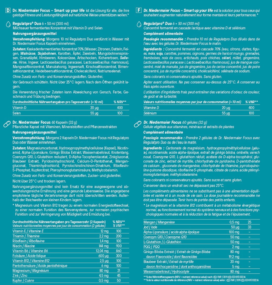 Dr. Niedermaier Focus - Smart up your life est la solution pour tous ceux qui souhaitent augmenter naturellement leur forme mentale et leurs performances.