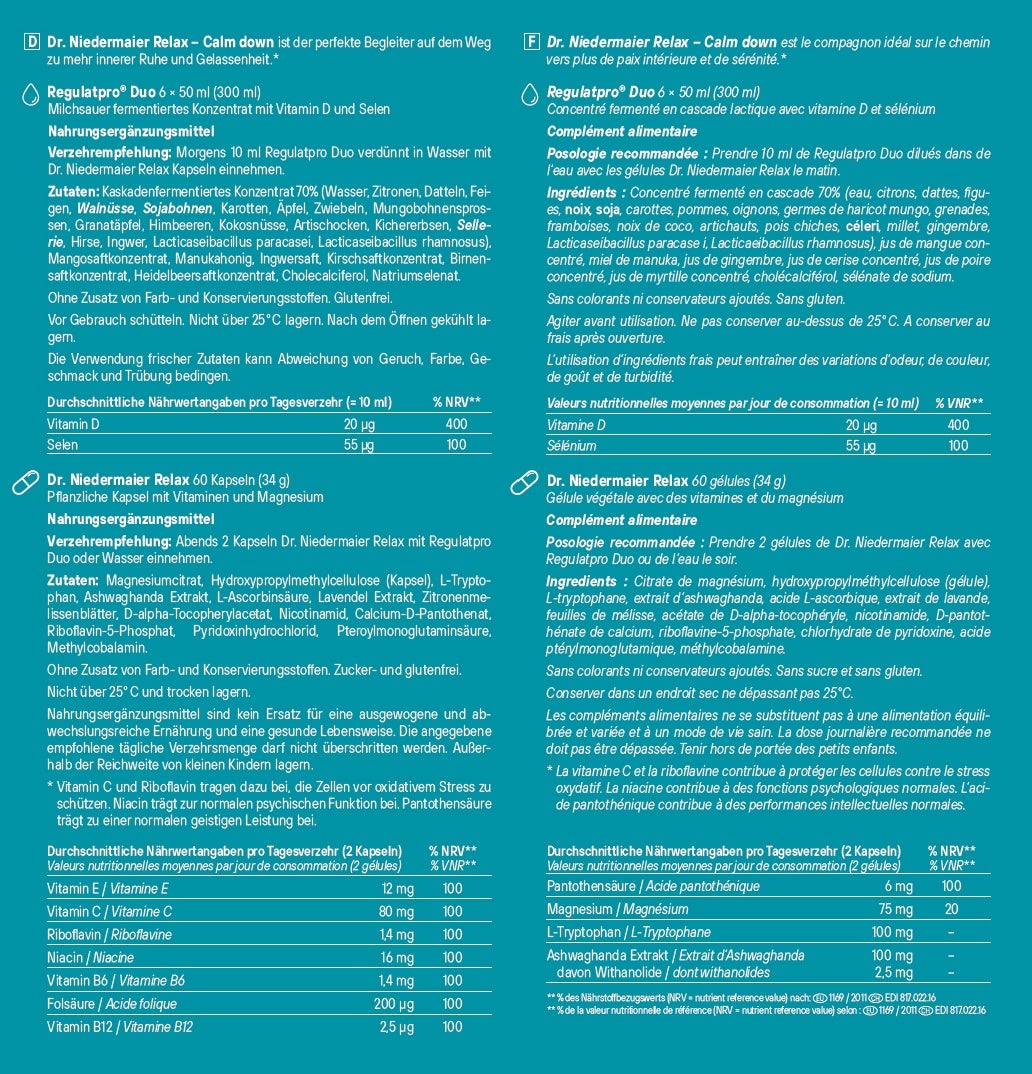Dr. Niedermaier Relax capsules: Citrate de magnésium, hydroxypropylméthylcellulose (capsule), L-tryptophane, extrait d'ashwaghanda, acide L-ascorbique, extrait de lavande, feuilles de mélisse citronnée, acétate de D-alpha-tocophérol, nicotinamide, D-pantothénate de calcium, riboflavine-5-phosphate, chlorhydrate de pyridoxine, acide ptéroylmonoglutamique, méthylcobalamine.