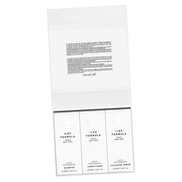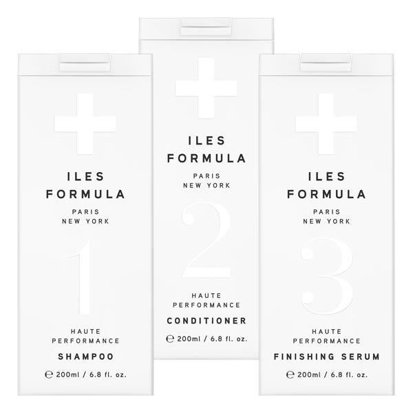 Iles Formula Shampoo : Le shampoing haute performance Iles Formula nettoie les cheveux en profondeur sans décolorer et améliore la facilité de coiffage. Il est composé des ingrédients les plus exclusifs et les plus riches en antioxydants. La sève de racine activement extraite et la vitamine B5 reconstruisent les follicules pileux, nourrissent les pointes et préviennent les cheveux cassants. Le shampoing répare les pointes fourchues en un rien de temps. Un volume luxueux, une souplesse douce et une brillance irrésistible confèrent aux cheveux les protéines de soie qu'ils contiennent dès le premier lavage. Le shampoing haute performance Iles Formula donne un rebondissement à couper le souffle et une sensation de cheveux détendus. Convient à tous les types de cheveux. Exempt de parabènes, de silicones, de sulfates et d'allergènes. Application : Massez doucement sur les cheveux humides, laissez agir un court instant puis rincez abondamment. Iles Formula Conditioner : Le Iles Formula Conditioner, le fleuron de la gamme de soins capillaires, avec ses ingrédients est un produit de rajeunissement des cheveux pour une expérience de soins ultime, pour des cheveux sains avec un délicat parfum de bouquet de fleurs blanches. Testé sur les cheveux des femmes les plus célèbres du monde, il répare et revitalise les cheveux même cassants et abîmés en un seul traitement. La formule sans parabène est conçue pour renforcer les cheveux de la racine aux longueurs et aux pointes, les transformant en une perfection soyeuse. Les vitamines E et B5, les huiles du palmier Tucuma et l'huile Pracaxi de la forêt amazonienne agissent dès la première application. Convient à tous les types de cheveux. Sans parabènes, silicones, sulfates, allergènes. Demande : Appliquez l'après-shampooing sur les cheveux déjà lavés et séchés à la serviette. Laissez agir brièvement et rincez ensuite abondamment. Iles Formula Serum : Iles Formula Finishing Serum peut être utilisé sur les cheveux secs ou humides. Le traitement pénétrant en profondeur, avec sa formule légère et sans parabène, ne graisse pas et n'alourdit pas les cheveux. Il les protège de la chaleur, de l'humidité et de la décoloration causées par les rayons UV nocifs. Des ingrédients choisis à la main, tels que la kératine, l'huile d'argan, le beurre de tucuma, la soie hydrolysée et le panthénol, ainsi que des molécules de type céramique, renforcent également la fibre capillaire et réparent les pointes fourchues. La touche finale parfaite pour toutes les coiffures et tous les types de cheveux. Sans parabènes ni allergènes. Demande : Travaillez sur des cheveux secs ou séchés à la serviette. Ne pas rincer. Dans un marché très encombré de produits de soins capillaires spéciaux, la réponse de Iles Formula est simple : Un produit pour tous les types de cheveux, tous les âges et toutes les races. Avec ses ingrédients triés sur le volet et ses flacons luxueux - immédiatement efficaces, élégants et chics - Iles Formula made in France répond aux exigences de la Haute Performance.