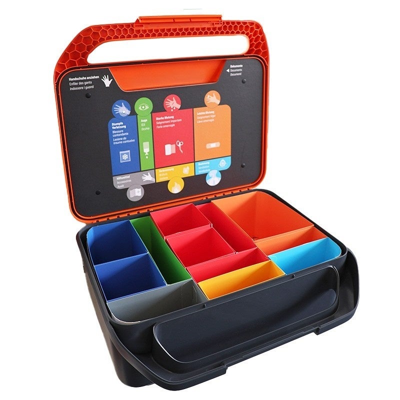 Le WERO Smart Case® grande, vide, est une solution étudiée et élégante pour une organisation des premiers secours structurée et fiable. Son boîtier robuste en plastique ABS assure protection et stabilité, tandis que l’aménagement intérieur modulaire permet un équipement personnalisé. Des structures claires, un système de guidage par couleurs avec pictogrammes et des plaques transparentes facilitent une orientation rapide en cas d’urgence.