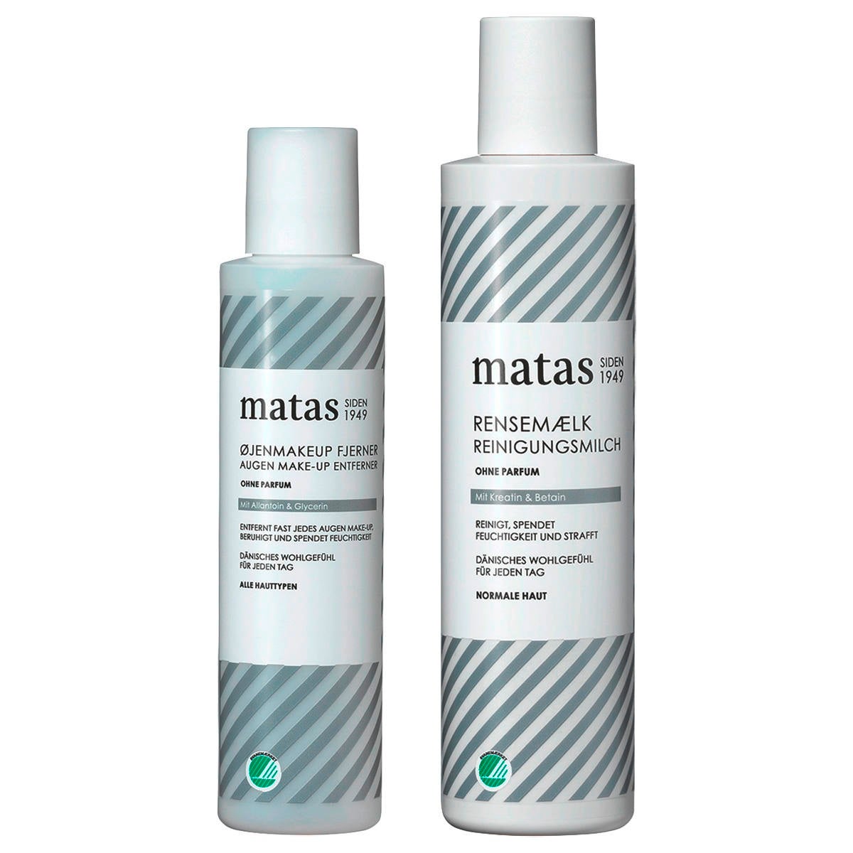 MATAS Striber Augen Make-Up Entferner: Aqua, Caprylic/Capric Triglyceride, Glycerin, Cetearyl Alcohol, Glyceryl Stearate Citrate, Sodium Cocoamphoacetate, Cetyl Palmitate, Allantoin, Xanthan Gum, Sodium Gluconate, Citric Acid, Phenoxyethanol, Chlorhexidine Digluconate. MATAS Striber Reinigungsmilch: Aqua, Coco-Caprylate/Caprate, PEG-7 Glyceryl Cocoate, Betaine, Cetearyl Alcohol, Glyceryl Stearate Citrate, Creatine, Caprylyl Glycol, Ethylhexylglycerin, Xanthan Gum, Sodium Gluconate, Phenoxyethanol