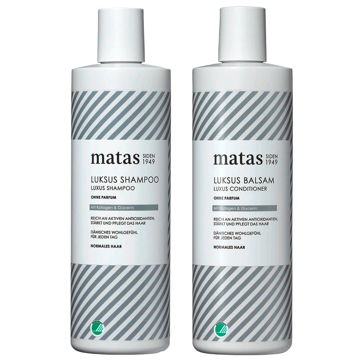 MATAS Striber Luxus Conditioner: Aqua, Behenamidopropyl Dimethylamine, Glycerin, Cetearyl Alcohol, Glyceryl Stearate Citrate, Distearoylethyl Dimonium Chloride, Lactic Acid, Hydrolyzed Collagen, Sodium Gluconate, Phenoxyethanol, Sodium Benzoate. MATAS Striber Luxus Shampoo: Aqua, Glycerin, Sodium Laureth Sulfate, Cocamidopropyl Betaine, Lauryl Glucoside, Glycol Distearate, PEG-7 Glyceryl Cocoate, Daucus Carota Sativa Root Extract, Hydrolyzed Collagen, Guar Hydroxypropyltrimonium Chloride, Caprylyl Glycol, Glycine Soja Oil, Dicaprylyl Ether, Glyceryl Oleate, Tocopherol, Triticum Vulgare Protein, 1, 2-Hexanediol, Decyl Glucoside, Laureth-4, Sodium Chloride, Sodium Gluconate, Citric Acid, Sodium Benzoate, Benzoic Acid, Phenoxyethanol, Beta-Carotene