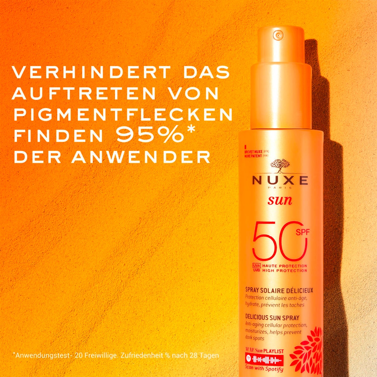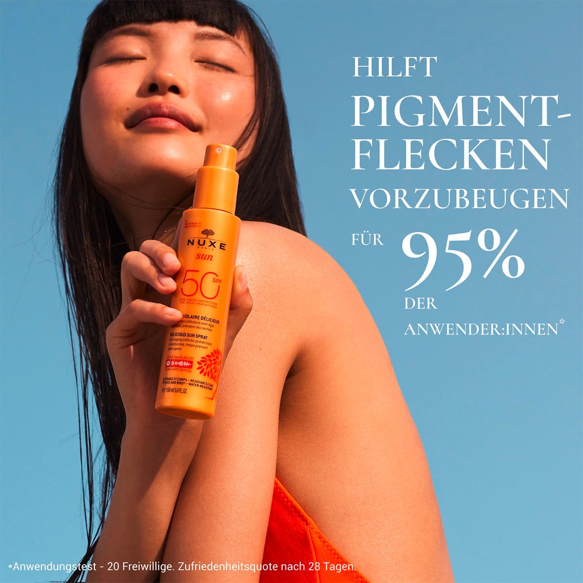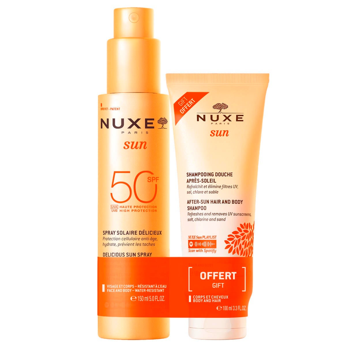 NUXE Sun Sonnenspray Gesicht & Körper LSF 50: AQUA/WATER, DIBUTYL ADIPATE, DIETHYLAMINO HYDROXYBENZOYL HEXYL BENZOATE, DIISOPROPYL SEBACATE, ETHYLHEXYL TRIAZONE, ALCOHOL DENAT., GLYCERIN, POLYGLYCERYL-6 STEARATE, ISOPROPYL LAUROYL SARCOSINATE, PARFUM/FRAGRANCE, BIS-ETHYLHEXYLOXYPHENOL METHOXYPHENYL TRIAZINE, PHENYLBENZIMIDAZOLE SULFONIC ACID, BENZYL ALCOHOL, MICROCRYSTALLINE CELLULOSE, ARGININE, HELIANTHUS ANNUUS (SUNFLOWER) SEED OIL, CETEARYL ALCOHOL, GLYCERYL STEARATE, POLYGLYCERYL-6 BEHENATE, ETHYLHEXYLGLYCERIN, SODIUM GLUCONATE, CELLULOSE GUM, INOSITOL, ETHYL FERULATE, CITRIC ACID, ROSMARINUS OFFICINALIS (ROSEMARY) LEAF EXTRACT, TOCOPHEROL, TETRAMETHYL ACETYLOCTAHYDRONAPHTHALENES, CITRUS AURANTIUM PEEL OIL, LINALYL ACETATE, LIMONENE, LINALOOL, CITRONELLOL, DIMETHYL PHENETHYL ACETATE, GERANIOL, PELARGONIUM GRAVEOLENS FLOWER OIL, ISOEUGENYL ACETATE [N5102/B]. NUXE Sun After-Sun-Duschshampoo: AQUA/WATER, DICAPRYLYL CARBONATE, ALCOHOL, DIBUTYL ADIPATE, DICAPRYLYL ETHER, BRASSICA CAMPESTRIS (RAPESEED) SEED OIL, COCO-CAPRYLATE/CAPRATE, ETHYLHEXYL TRIAZONE, DIETHYLAMINO HYDROXYBENZOYL HEXYL BENZOATE, PARFUM/FRAGRANCE, SIMMONDSIA CHINENSIS (JOJOBA) SEED OIL, SODIUM CHLORIDE, COCOS NUCIFERA (COCONUT) OIL, PANTHENOL, FRUCTOOLIGOSACCHARIDES, TOCOPHEROL, INULIN, CITRIC ACID, PANTOLACTONE, LIMONENE, LINALOOL, CITRONELLOL, GERANIOL. [N4803/A].