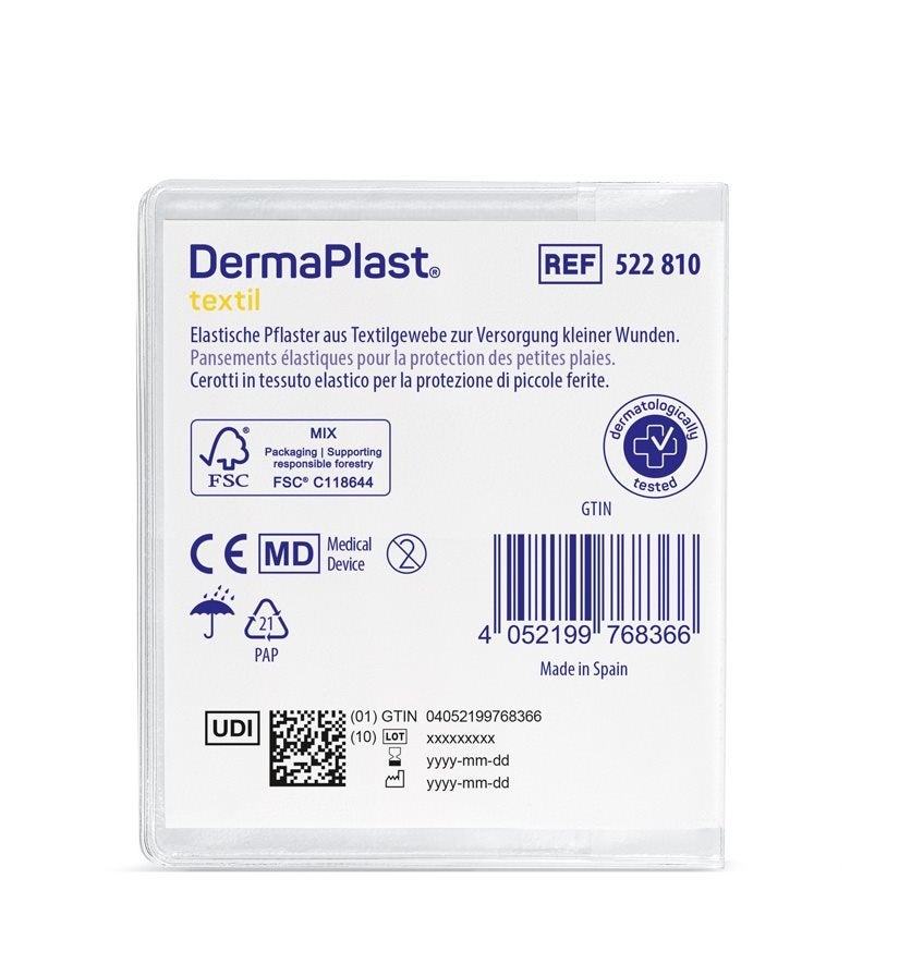 Dermaplast Textil Centro Strip en tissu textile élastique sont adaptables, perméables à l'air et résistants. Les pansements ont un coussinet qui ne colle pas à la plaie et sont hypoallergéniques grâce à l'adhésif doux pour la peau.
