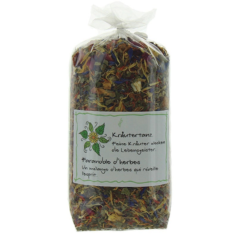 Apfelstücke, Brombeerblätter, Sultaninen, Orangenschalen, Färberdisteln, Pfefferminze, Lemon-Myrtle, Zitronenschalen, Brennnesselblätter, gefriergetrocknete Erdbeerstücke, blaue Kornblumenblüten, Ringelblumen, Rosenblüten