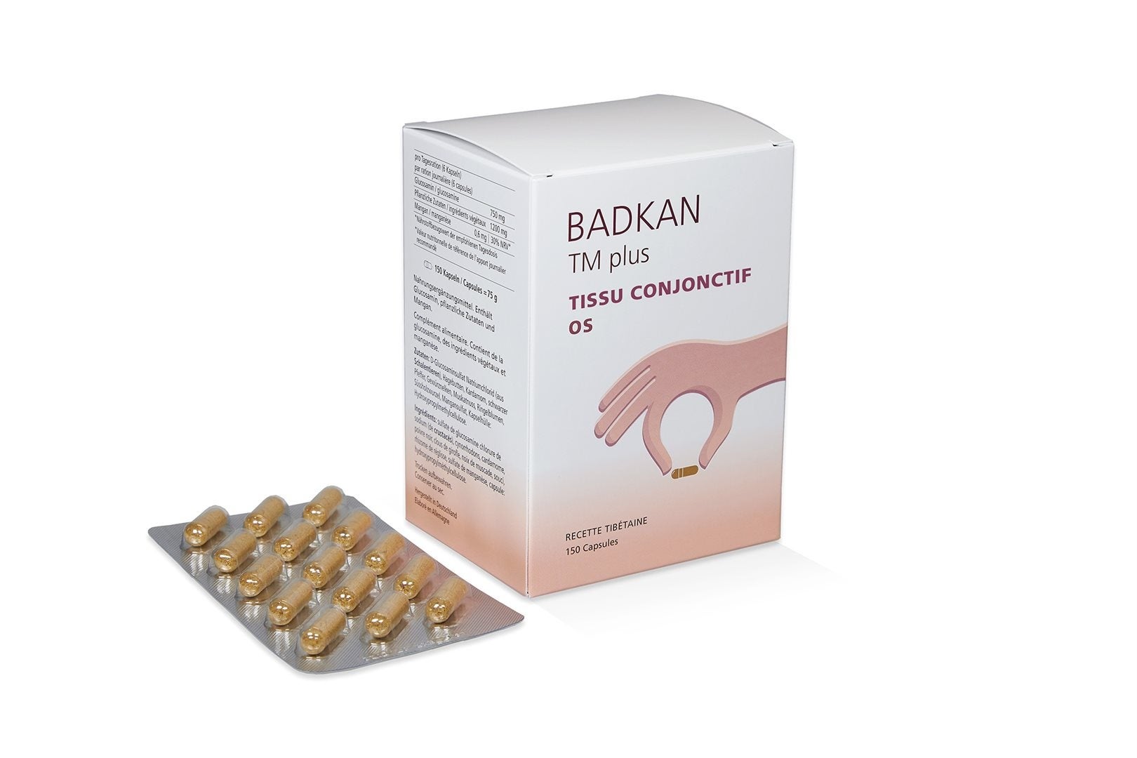 Ingrédients: sulfate de glucosamine chlorure de sodium (de crustacés) 39%, capsule: hydroxypropyl-methylcellulose, cynorrhodons, cardamome, poivre noir, clous de girofle, noix de muscade, souci, rhizome de réglisse, sulfate de manganèse.