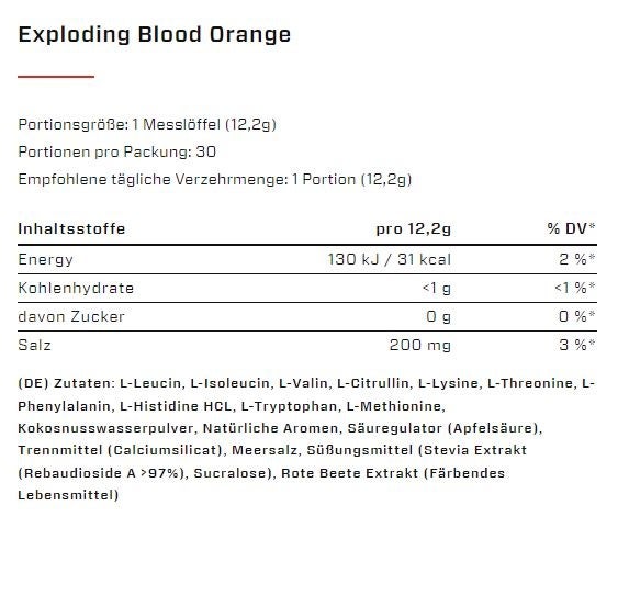 L-leucine, L-isoleucine, L-valine, L-citrulline, L-lysine, L-thréonine, L-phénylalanine, L-histidine HCL, L-tryptophane, L-méthionine, eau de noix de coco en poudre, arômes naturels, régulateur d'acidité (acide malique), anti-agglomérant (silicate de calcium), sel marin, édulcorant (extrait de stévia (rébaudioside A >97%), sucralose), extrait de betterave rouge (colorant alimentaire).