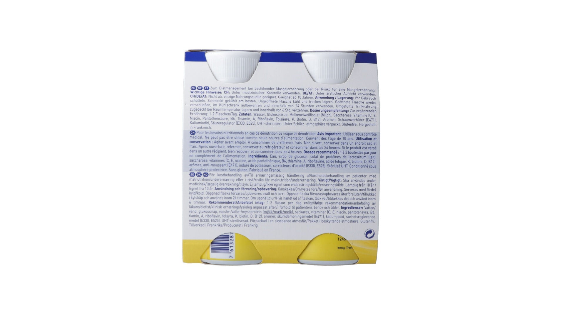 Eau, sirop de glucose, isolat de protéines de lactosérum (lait), saccharose, vitamines (C, E, niacine, acide pantothénique, B6, thiamine, A, riboflavine, acide folique, K, biotine, D, B12), arômes, anti-moussant (E471), iodure de potassium, correcteurs d’acidité (E330, E525).