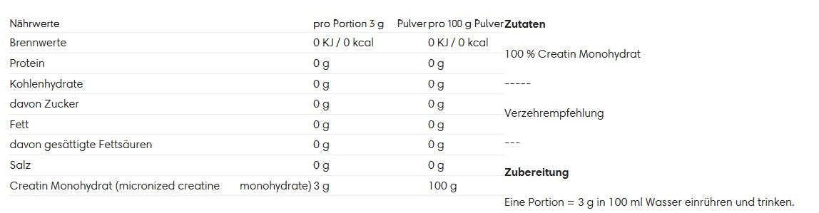Une portion par jour. La consommation peut entraîner une prise de poids. Ne pas dépasser le dosage recommandé indiqué. *Informations importantes : Ne pas dépasser une portion par jour. 3 g de créatine par jour augmentent les performances physiques lors d'un entraînement de force rapide dans le cadre d'une activité physique intense de courte durée.
