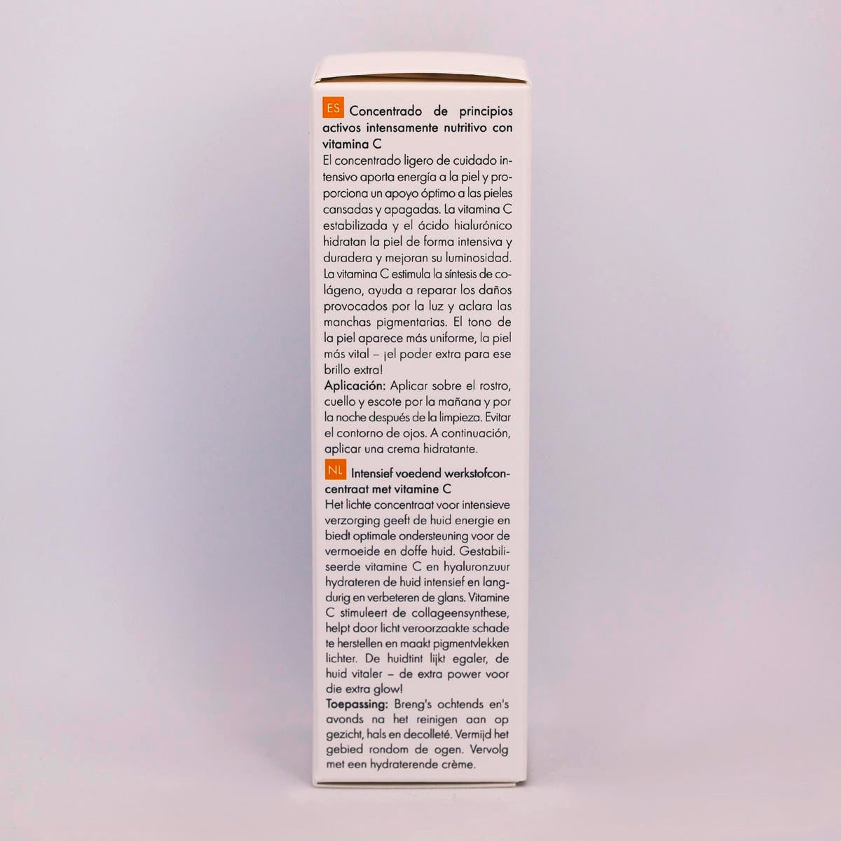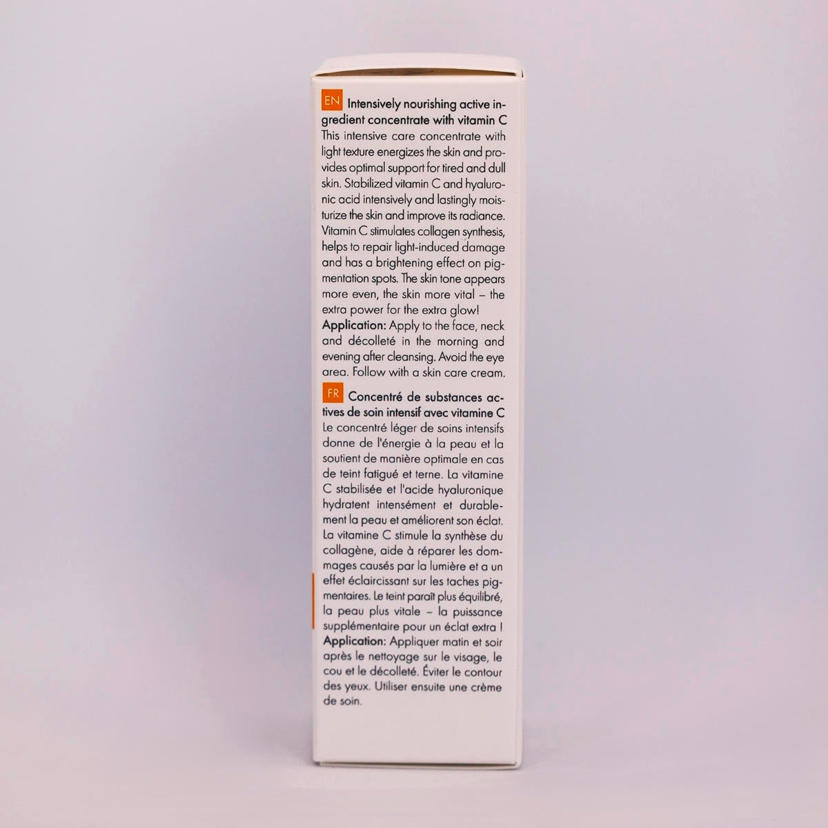 Ce concentré léger de soins intensifs donne de l'énergie à la peau et soutient de manière optimale le grain de peau fatigué et terne. La vitamine C stabilisée et l'acide hyaluronique hydratent intensément et durablement la peau et améliorent son éclat. La vitamine C stimule la synthèse du collagène, aide à réparer les dommages causés par la lumière et a un effet éclaircissant sur les taches pigmentaires. Le teint paraît plus équilibré, la peau plus vitale - la puissance supplémentaire pour un éclat extra ! Végétalien. Sans PEG, silicones, parabènes, paraffines, parfum. Utilisation : Appliquer matin et soir après le nettoyage sur le visage, le cou et le décolleté et masser doucement. Éviter le contour des yeux. Laisser pénétrer et utiliser ensuite une crème de soin.
