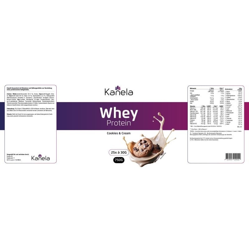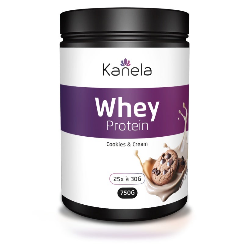 Kanela Whey Protein Cookies & Cream combine des protéines de lactosérum de première qualité avec le goût apprécié des cookies et de la crème tendre. Les pépites de protéines de soja croustillantes avec une note de cacao apportent une expérience gustative particulière et une texture agréable. Avec une teneur en protéines de plus de 80 % pour 100 g, cest le soutien idéal pour la construction et le maintien des muscles.