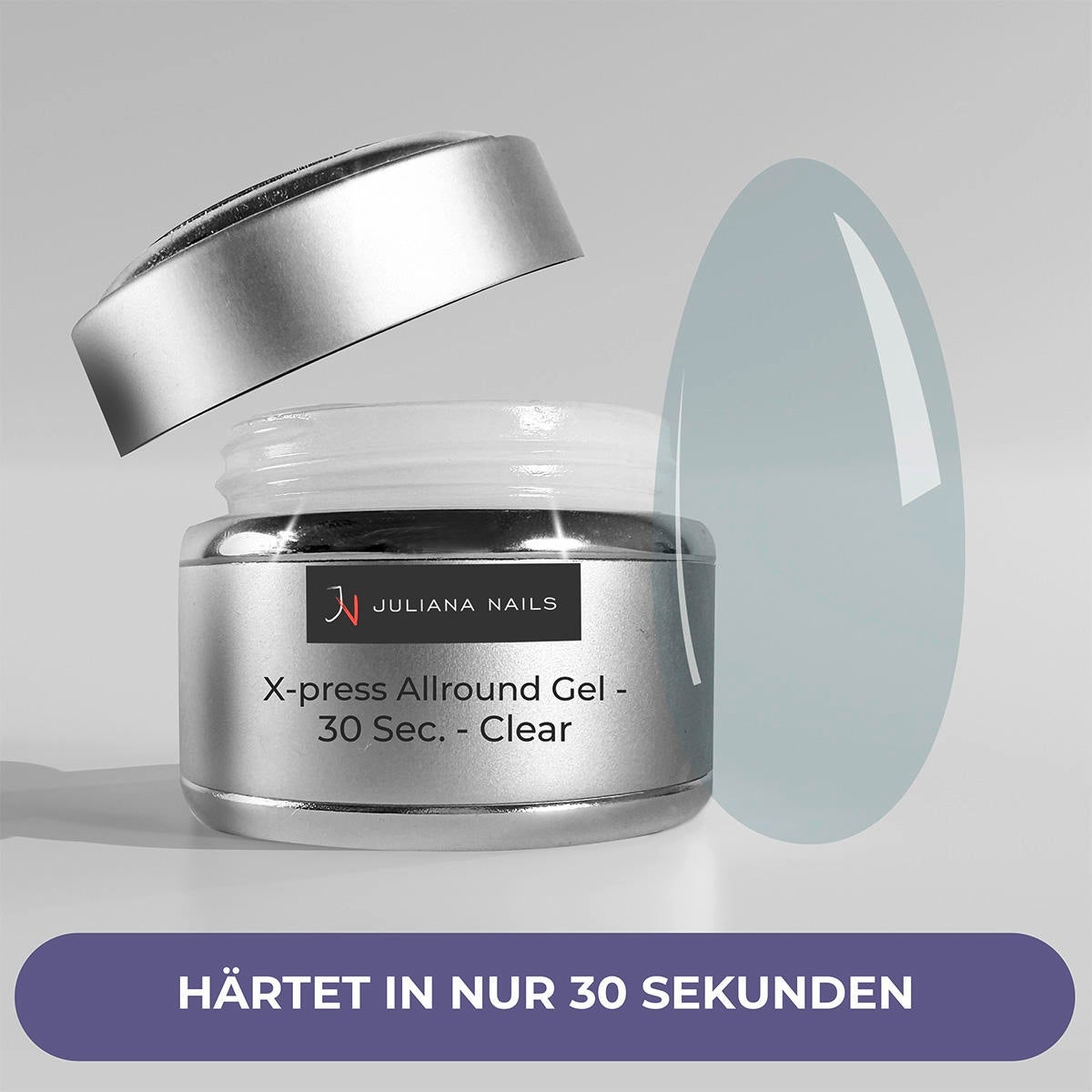 Des ongles de rêve en 30 secondes seulement ! Notre X-press Allround Gel - 30 Sec. - Clear est un véritable game-changer dans ton répertoire de design d'ongles, car il durcit en seulement 30 secondes ! Cela signifie pour toi : Moins de temps à la table à ongles et plus de temps pour profiter de tes magnifiques ongles. Ce gel ne se contente pas de durcir à la vitesse de l'éclair, il réunit également en un seul produit un gel d'adhérence, un gel de construction et un gel de scellement. Sa consistance moyenne à épaisse assure une application facile sans couler trop rapidement dans les bords de l'ongle et son effet auto-lissant intense permet de réduire le travail de limage.