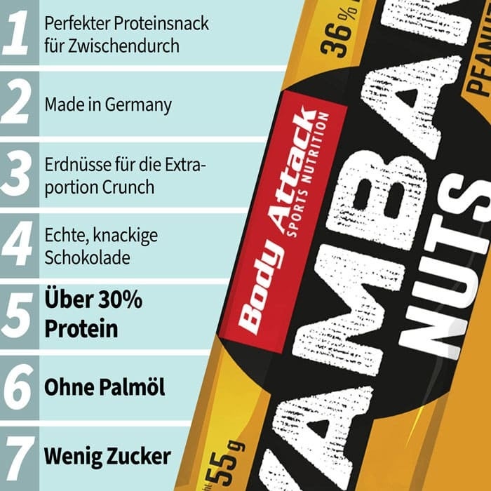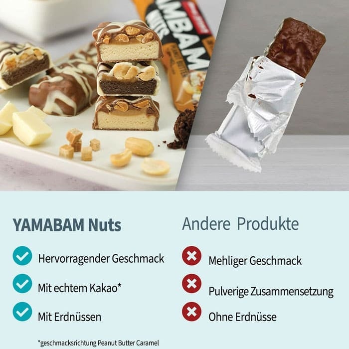 Tu veux un coup de pied dans la fourmilière ? Tu vas l'avoir ! De lui, là. Il est très fort. Je vous en prie : YAMBAM NUTS. La barre protéinée imbattable au goût unique. Presque pas de sucre. Mais plus de protéines. Plus de puissance. Son caractère unique lui est conféré par des cacahuètes croquantes, du caramel doux et une couche de chocolat au lait fondant. Et plus de 30% de protéines de qualité pour tes muscles. Notre snack sain est disponible en trois délicieuses variétés. Risque d'addiction garanti !