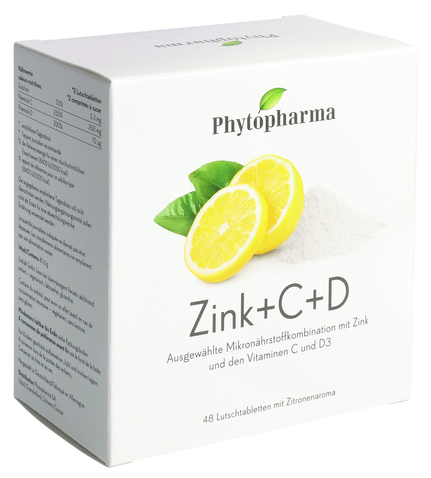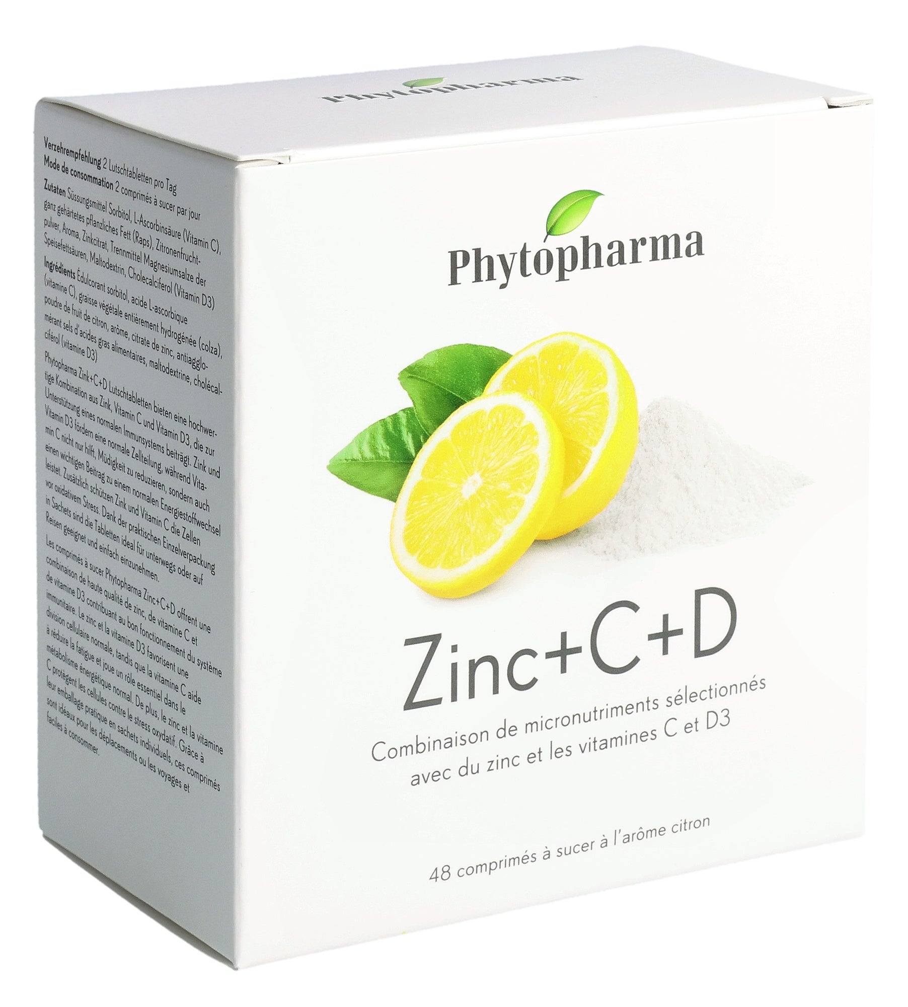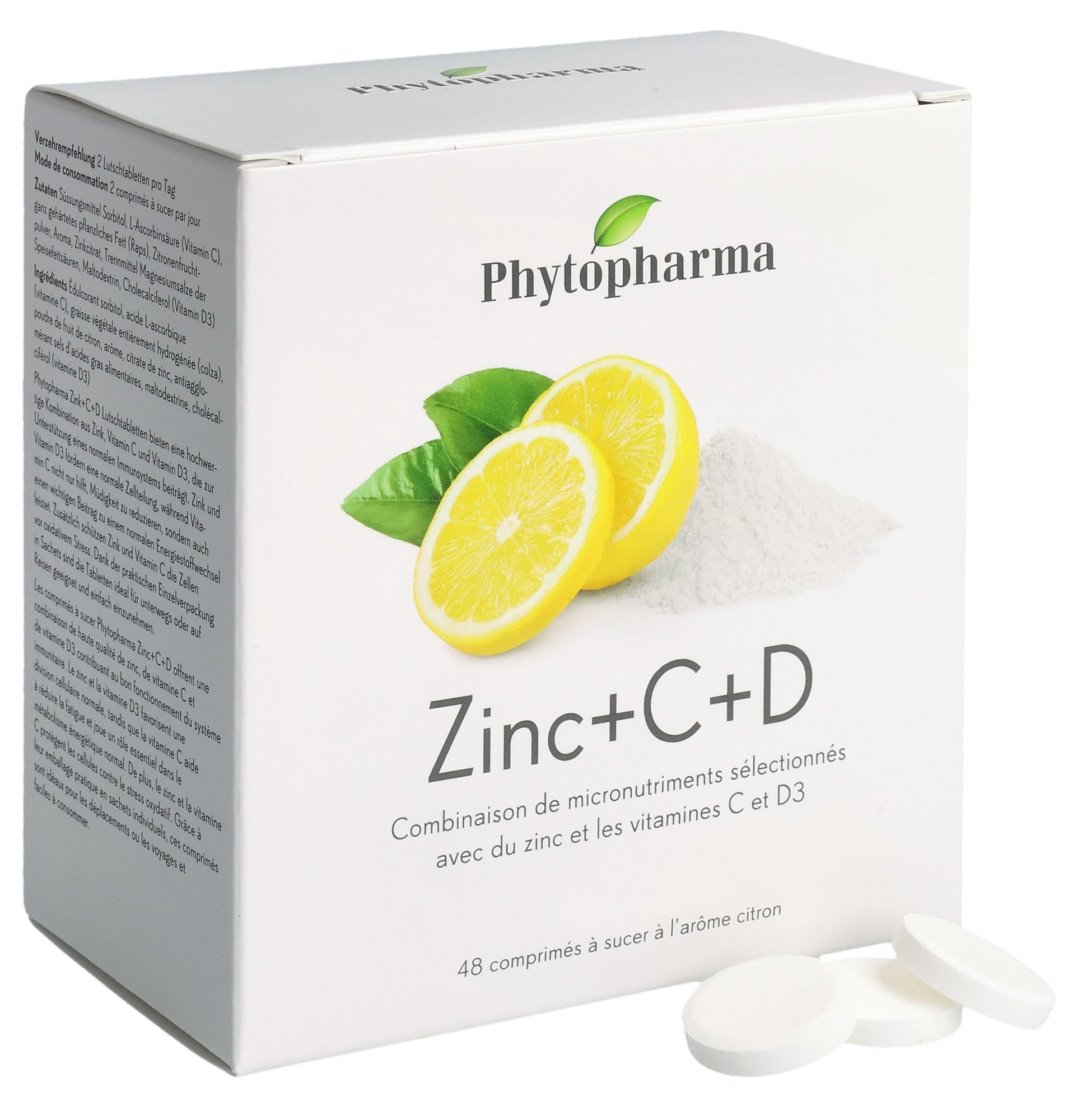 Édulcorant sorbitol, acide L-ascorbique (vitamine C), graisse végétale entièrement hydrogénée (colza), poudre de fruit de citron, arôme, citrate de zinc, antiagglomérant sels d’acides gras alimentaires, maltodextrine, cholécalciférol (vitamine D3).